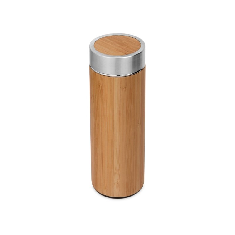Вакуумный термос с корпусом из натурального бамбука благодаря вакуумной изоляции и нержавеющей стали 304 пробы удерживает тепло напитков в течение 12 часов. В комплекте имеется съемное ситечко.