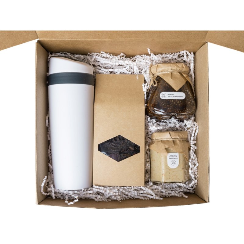 - Материал товара:коробка - картон, банка - стекло, термокружка - полипропилен