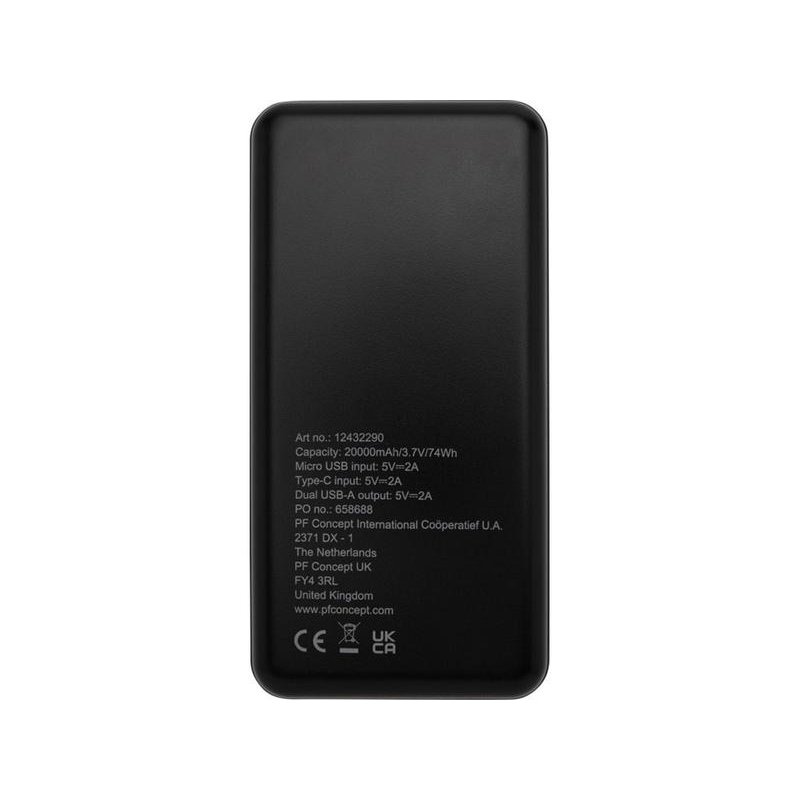 Портативное зарядное устройство изготовлено из переработанного пластика ABS. Портативное зарядное устройство работает от литий-полимерного аккумулятора класса А емкостью 20 000 мАч с длительным сроком службы для быстрой зарядки. Индикаторы питания показывают уровень оставшейся энергии, поэтому вы всегда будете знать, когда устройство необходимо зарядить. Вход Тип-C 5 В/2 А, вход Micro USB 5 В/2 A, двойной выход USB-A 5 В/2 А, общая мощность 10 Вт. Поставляется с зарядным кабелем USB-A - Type-C 2 А из термополиэтилена длиной 30 см, инструкцией по эксплуатации и подарочной коробкой из крафт-бумаги.