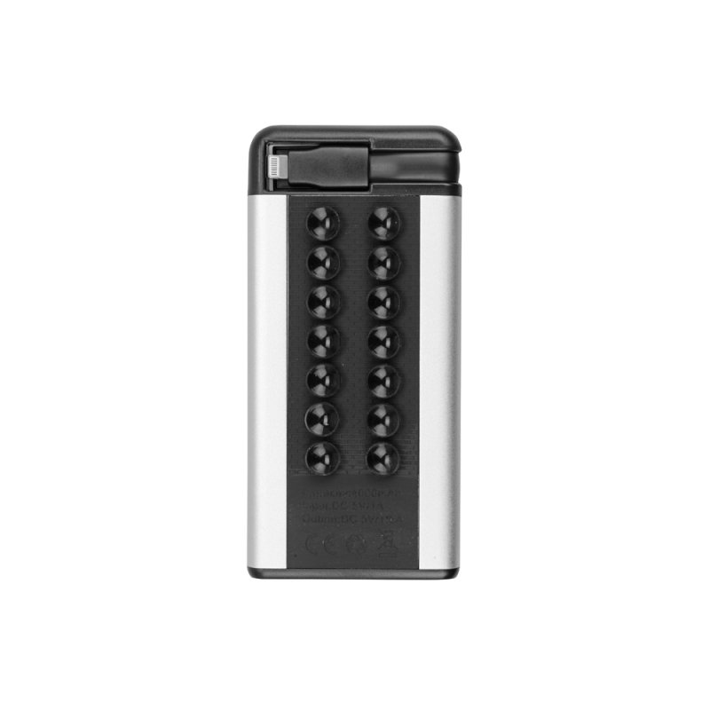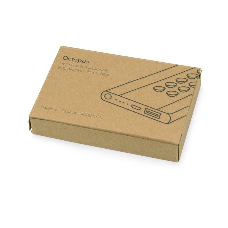 Портативное зарядное устройство (power bank) Octopus, 4000 mAh в тонком металлическом корпусе. На одной стороне расположены силиконовые присоски, благодаря которым смартфон или планшет станет единым целым с зарядным устройством. На другой имеется большая поверхность под нанесение. Внешний аккумулятор снабжен универсальным компактным кабелем 2-в-1 с разъемами usb-micro и Lightning. Универсальный кабель крепится в углубление на корпусе повербанка.