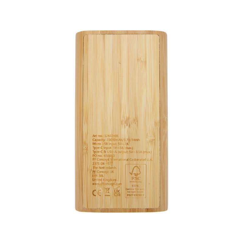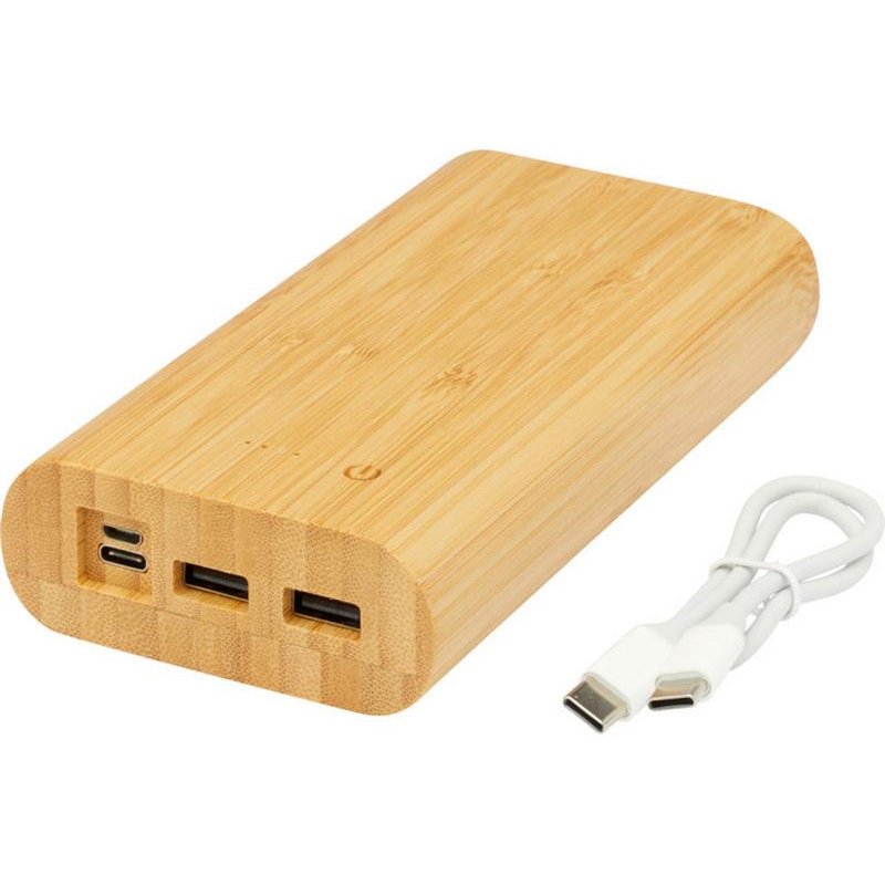 Портативное зарядное устройство емкостью 20 000 мАч из бамбука с сенсорной кнопкой включения/выключения и 4 светодиодными индикаторами для отображения оставшейся емкости батареи. Вход Micro USB 5 В/2 А, вход Type-C 5 В/3 А, выход Type-C 5 В/3.1 А макс., двойной выход USB-A 5 В/3.1 А макс., общая мощность 15.5 Вт. Поставляется с зарядным кабелем Type-C - Type-C 3 А из термополиэтилена длиной 30 см, инструкцией по эксплуатации и подарочной коробкой из крафт-бумаги. Поскольку бамбук — природный материал, цвет и размер сырья могут быть разными, что, в свою очередь, может повлиять на итоговый вид печати.