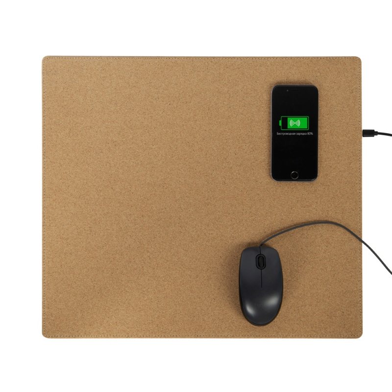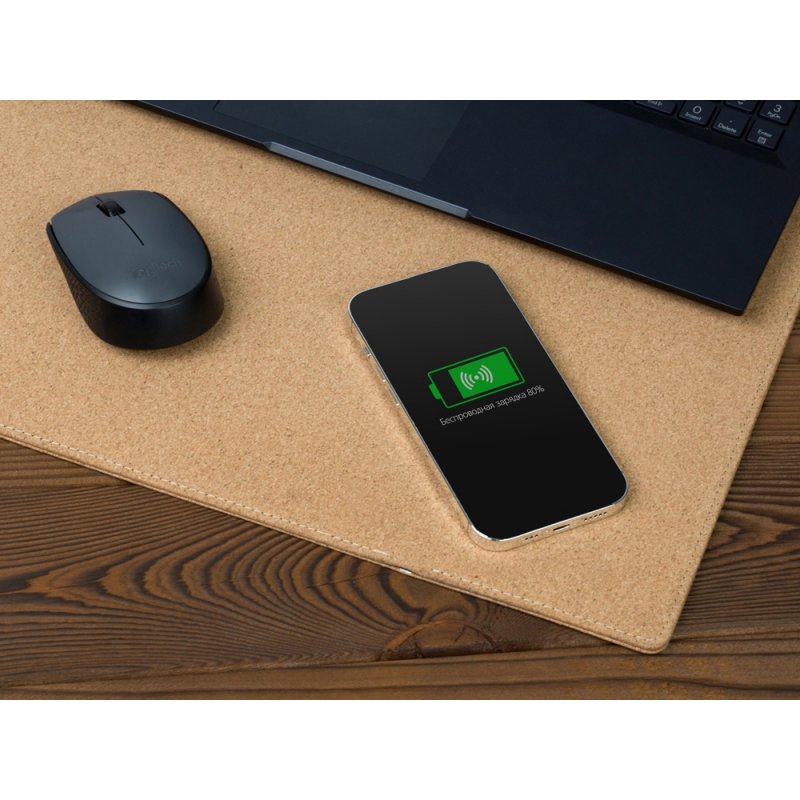 Большой (45 х 40 см) коврик из пробки для мышки, который может заряжать Qi-совместимые устройства методом беспроводной зарядки. Коврик позволяет разместить не только мышку, но и небольшой ноутбук или планшет. Коврик решает проблему скольжения мышки, обеспечивает бесшумное перемещение мыши по поверхности, позволяет декорировать интересным способом рабочее место. В комплекте длинный зарядный кабель 100 см. Коврик не складывается.