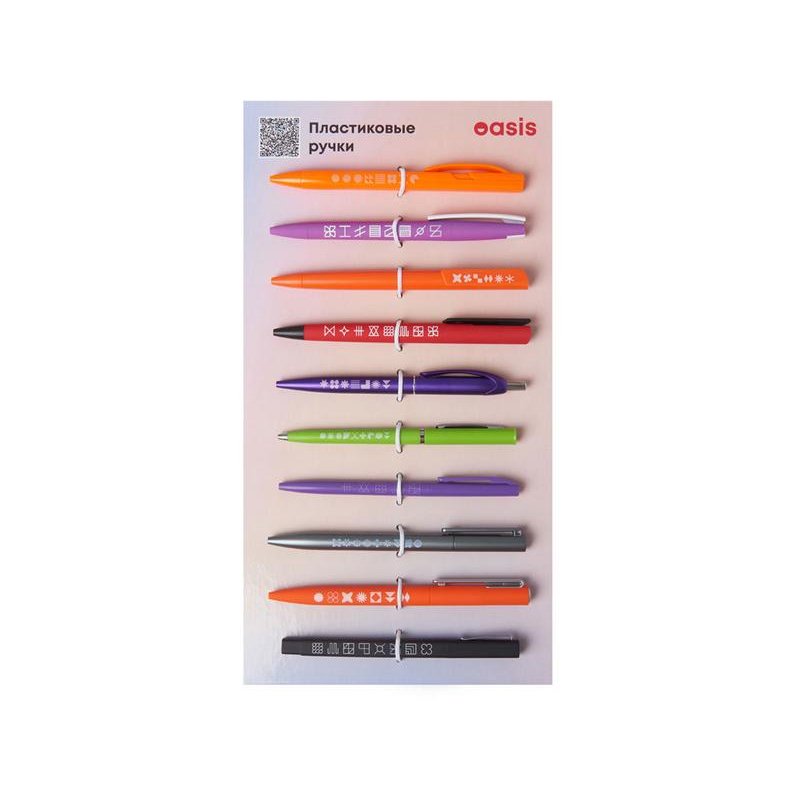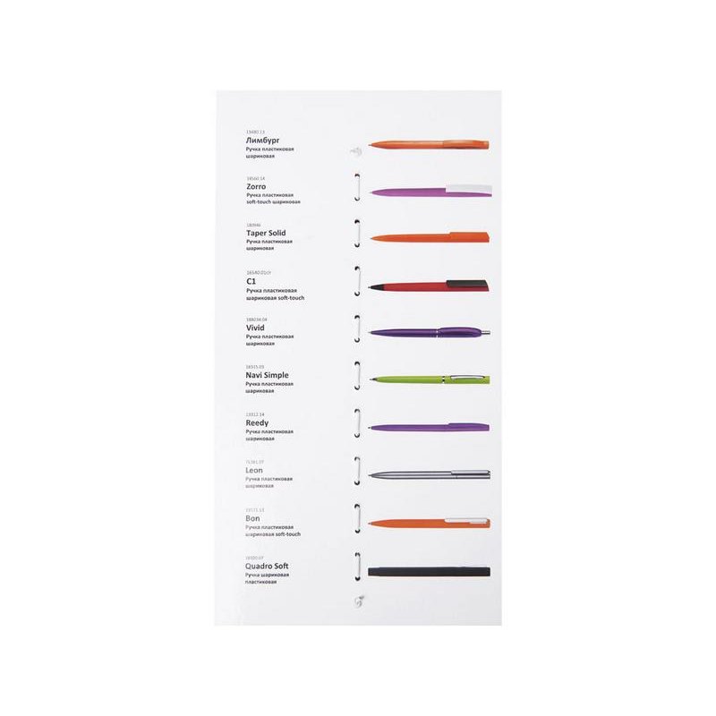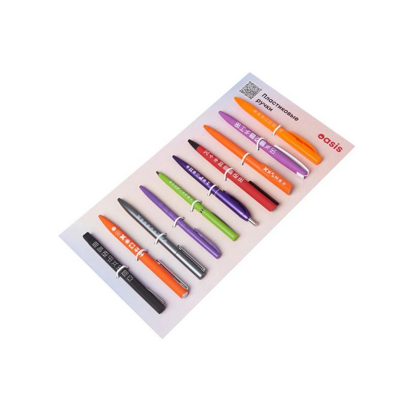 Промо-сет пластиковых ручек — это презентационный комплект, включающий 10 уникальных моделей с несколькими вариантами нанесения: УФ-печать, тампопечать и трафаретная печать.