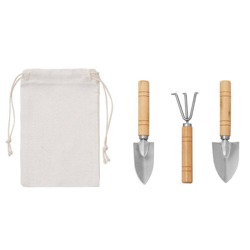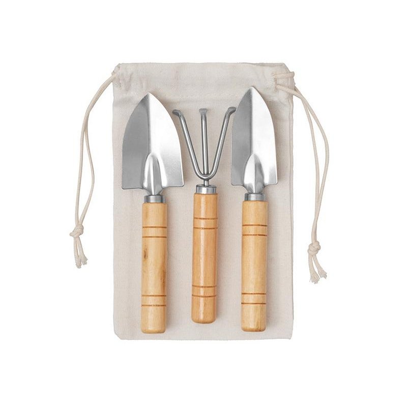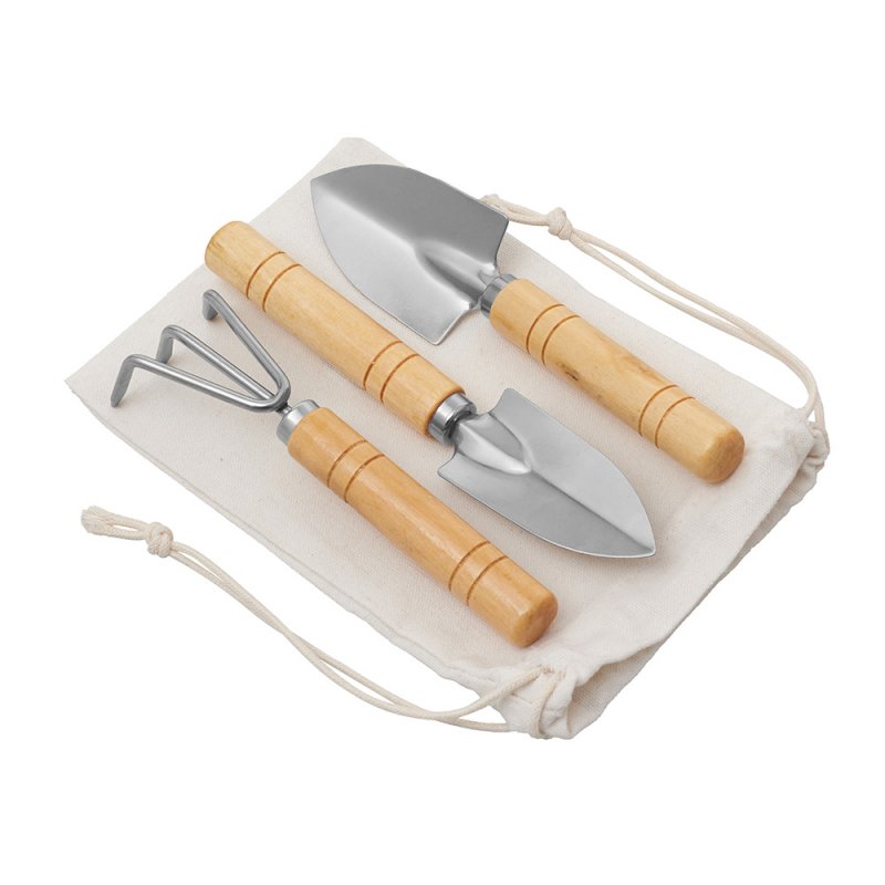 Садовый набор из 3 аксессуаров из нержавеющей стали с бамбуковыми ручками. Включает большую и малую лопатки и грабли. В комплект входит хлопковый мешочек.