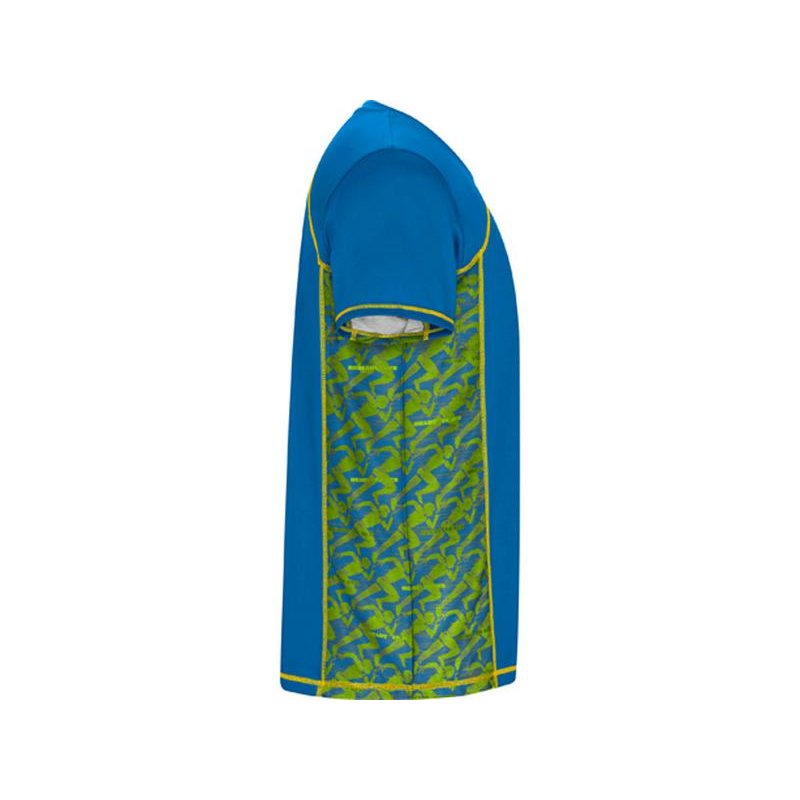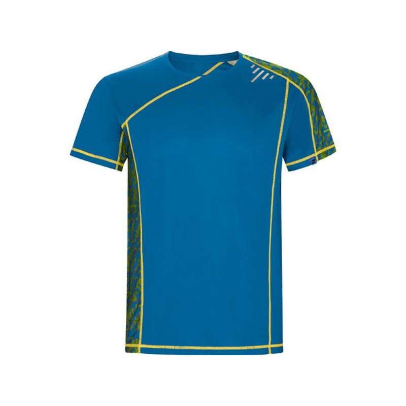 Спортивная футболка с коротким рукавом и принтованными вставками. Контрастные отстрочки плоским швом, светоотражающие элементы на полочке и спинке. Эко лейбл на рукаве.