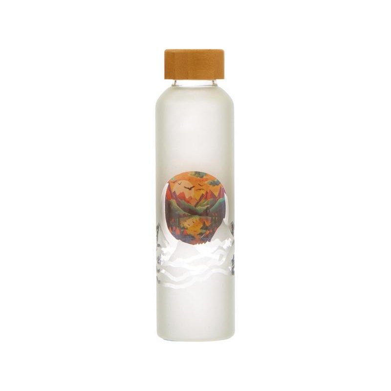 Образец возможностей круговой УФ-печати на матовой бутылке: на корпусе выборочно использовано прозрачное нанесение (силуэты гор и круглое окошко), которое создает интересный эффект.