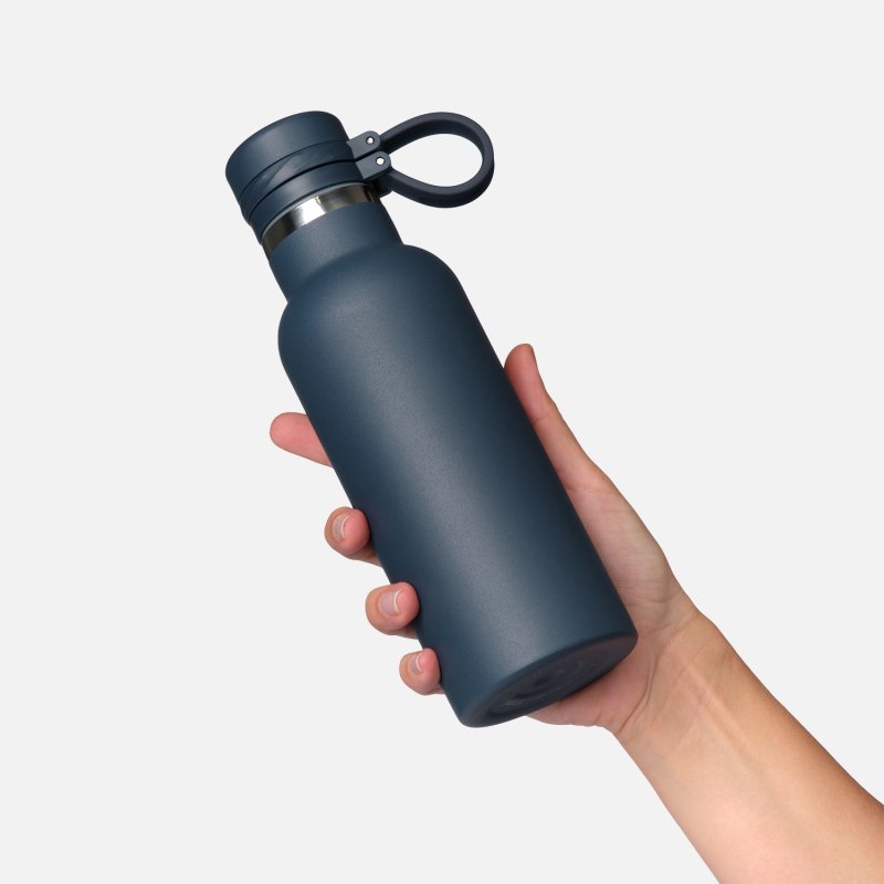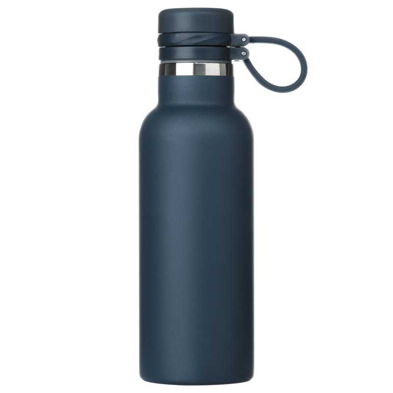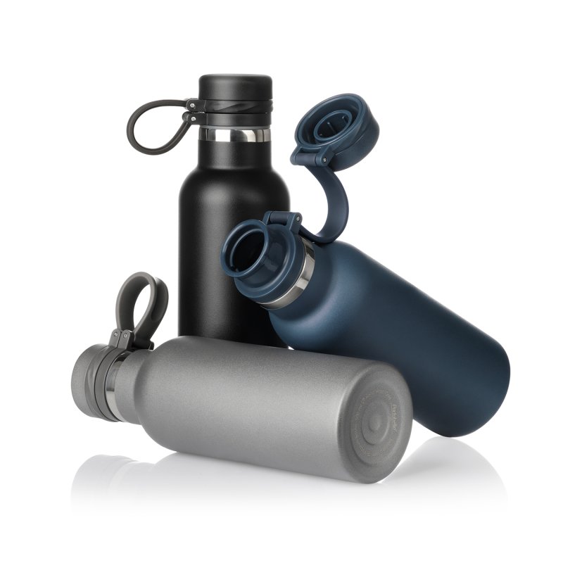 Вакуумная герметичная конструкция выполнена из двухслойной высоколегированной стали 304 марки, что делает конструкцию более прочной и устойчивой к мелким сколам и царапинам. Крышка из высококачественного пластика, оснащена удобной силиконовой петелькой для переноски. Бутылку можно переворачивать и класть в сумку.
