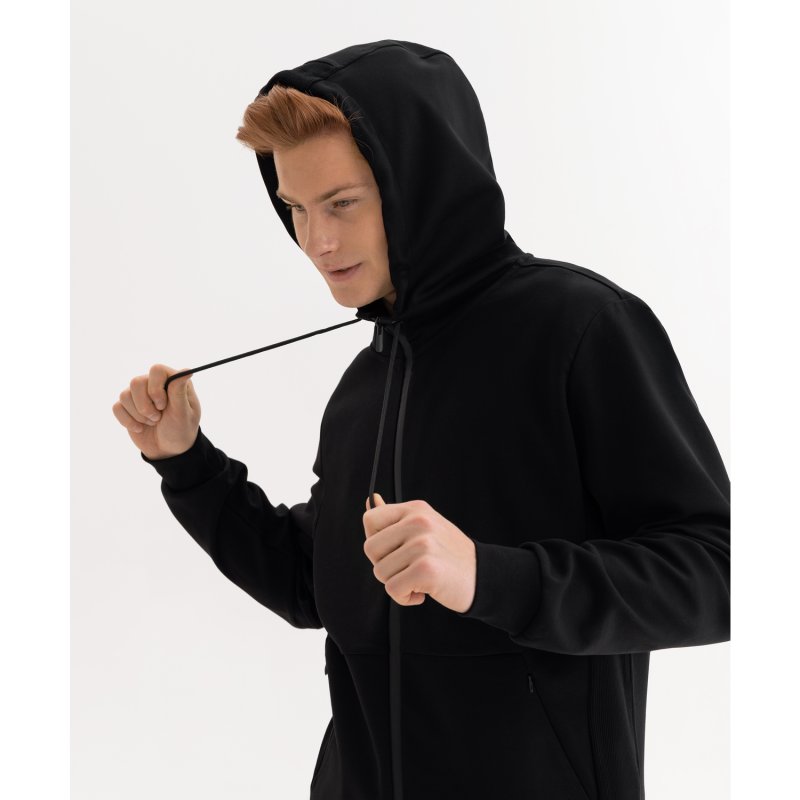 Толстовка сделана из мягкой и прочной ткани интерлок "doubleface", которая приятна к телу и легка в уходе, не растягивается, не выцветает и не деформируется после стирки. Манжеты и низ сделаны из плотной резинки 1х1, благодаря чему вещь держит форму. Карманы на потайных молниях придают толстовке аккуратный вид. Капюшон на подкладке в тон регулируется шнурками.