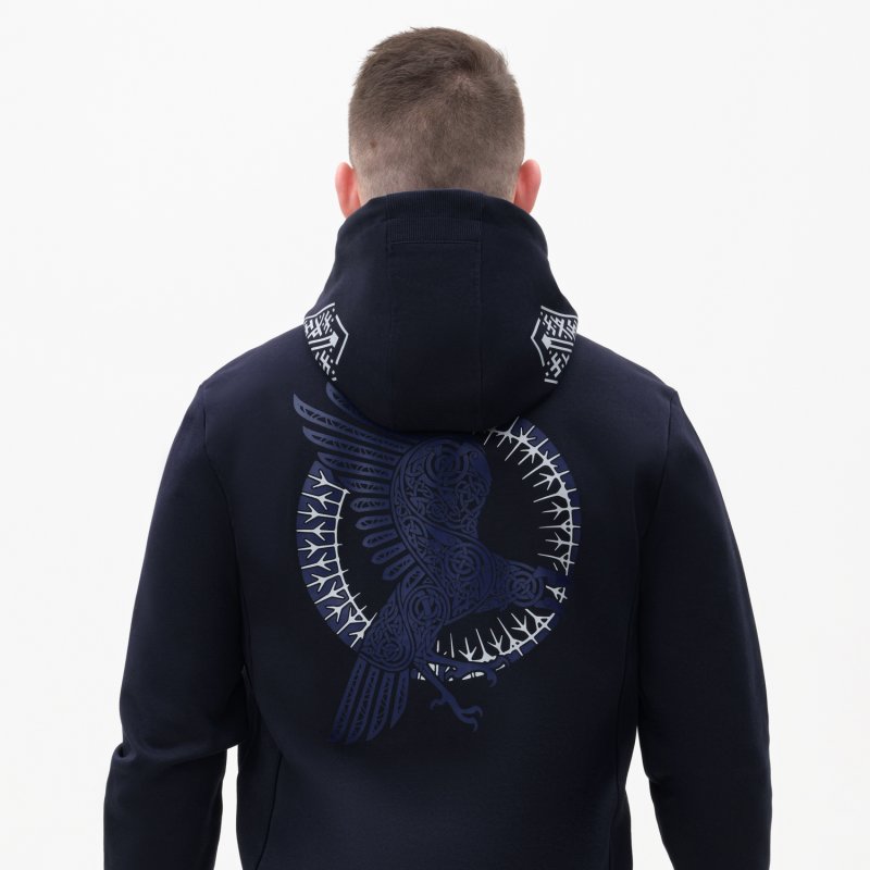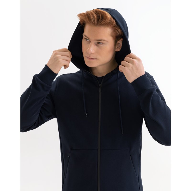 Толстовка сделана из мягкой и прочной ткани интерлок "doubleface", которая приятна к телу и легка в уходе, не растягивается, не выцветает и не деформируется после стирки. Манжеты и низ сделаны из плотной резинки 1х1, благодаря чему вещь держит форму. Карманы на потайных молниях придают толстовке аккуратный вид. Капюшон на подкладке в тон регулируется шнурками.