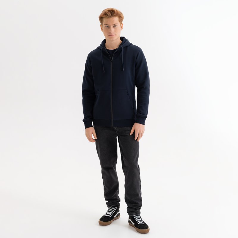 Универсальная толстовка на реверсной молнии прямого силуэта с капюшоном и прорезными карманами. Это базовая модель, которая сочетается с повседневным и спортивным стилем. За счет уникального кроя толстовка хорошо садится по фигуре и обеспечивает комфорт при движениях.