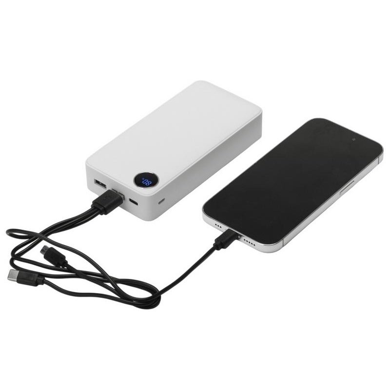 Внешний аккумулятор с покрытием soft-touch и цифровым дисплеем. Обе стороны можно украсить полноцветным УФ изображением. Ёмкости 20000 мАч хватает для зарядки смартфона, планшета, наушников и других гаджетов на всю неделю и больше. Поддержка быстрой зарядки устройств и 3 выходных порта подойдет современному человеку, так как никто не любит ждать. На фронтальной части расположен цифровой дисплей, показывающий текущий заряд аккумулятора в процентах. Функция быстрой зарядки будет отображаться на дисплее зелеными буквами PD (Power Delivery). При первом включении дисплей может отставать от реального заряда аккумулятора, но после первого же цикла разрядки-зарядки повербанка он настроится автоматически. Имеется 3 выходных разъема (USB-A * 2, USB-C) и 2 входных (USB-C, micro USB). Кабель с поддержкой быстрой зарядки (USB-C - USB-C) и универсальный кабель 3-в-1 в комплекте (Lightning, micro USB, USB-C). Можно брать в самолёт.