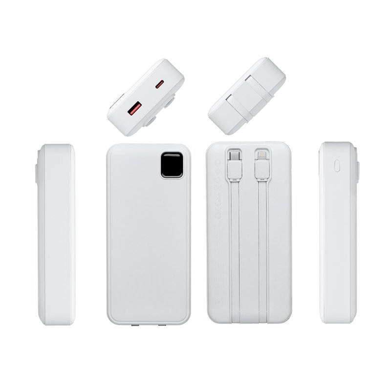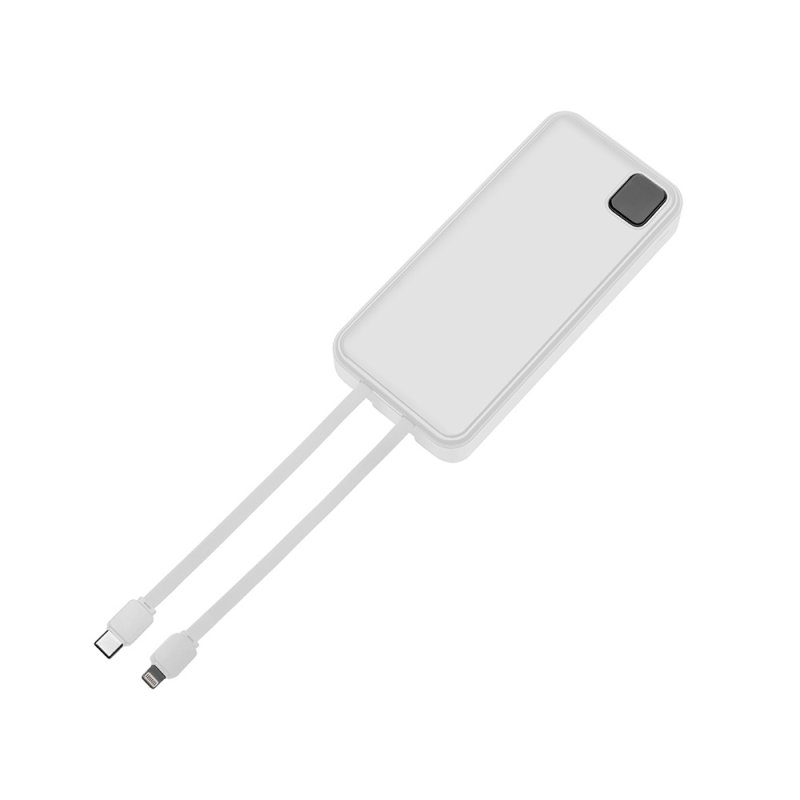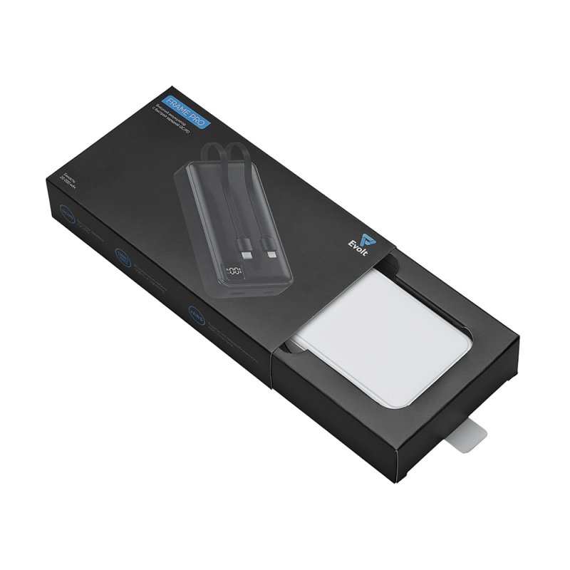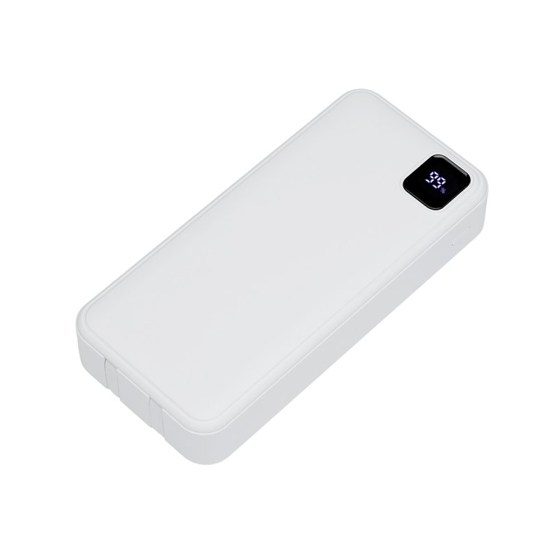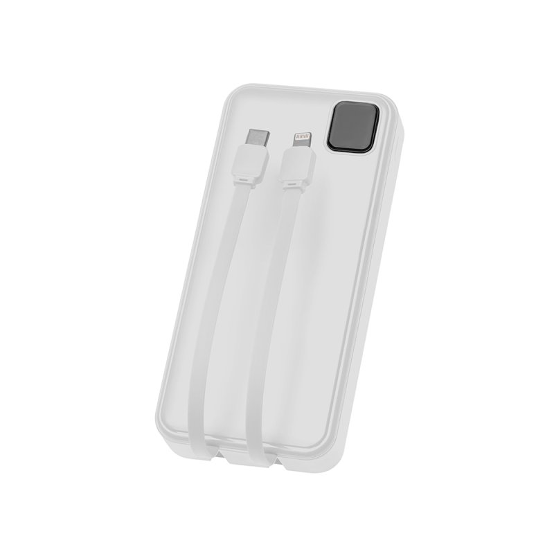 Удобный внешний аккумулятор с функцией быстрой зарядки и встроенными кабелями USB-C (симметричный разъём USB тип С)и Lightning (разъём в ранних версиях iPhone)— ваш надежный партнер в путешествиях, на встречах и в повседневных задачах. Цифровой дисплей в реальном времени показывает точный остаток заряда и статус быстрой зарядки, а встроенные кабели и несколько разъемов позволяют заряжать до 4 устройств. Прочный корпус из переработанного АБС-пластика и емкость 20000 мАч обеспечивают зарядом все ваши устройства на долгий срок. Идеальный выбор для тех, кто ценит комфорт и функциональность в одном устройстве. Продуманная упаковка: для открытия просто потяните за язычок, и появится гаджет с нанесением.