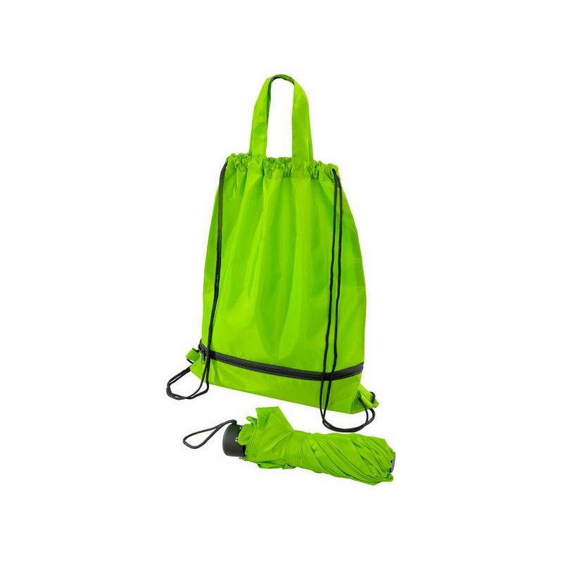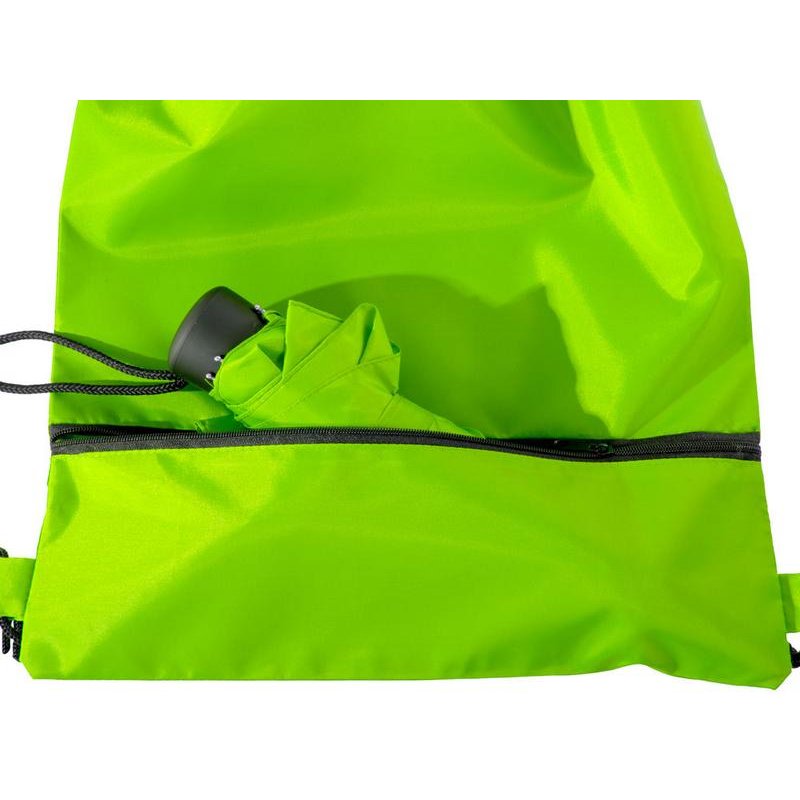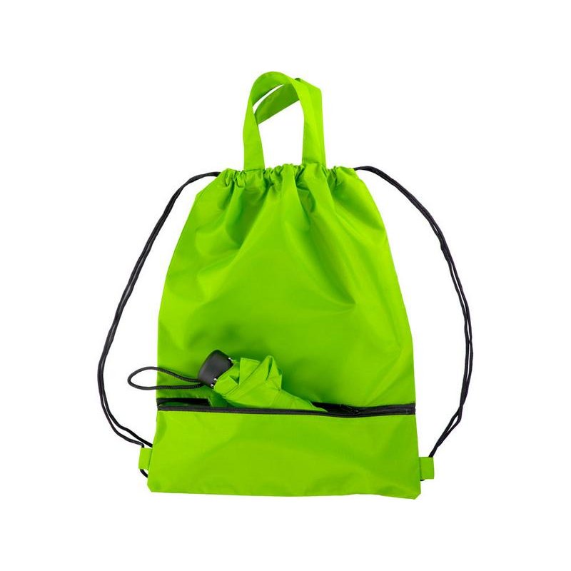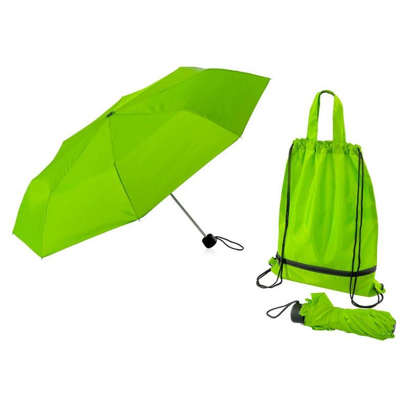 Механический зонт с прорезиненной ручкой идет в комплекте с сумочкой для покупок. На дне сумочки предусмотрен карман на молнии, в котором вы можете хранить зонт дома или прятать в него мокрый зонт, когда вы попали под дождь. Находясь в кармане сумочки, мокрый зонт не доставит неудобств. Сумочка имеет 2 варианта использования: шопер с двумя 2 ручками и рюкзак-мешок сошнурками.