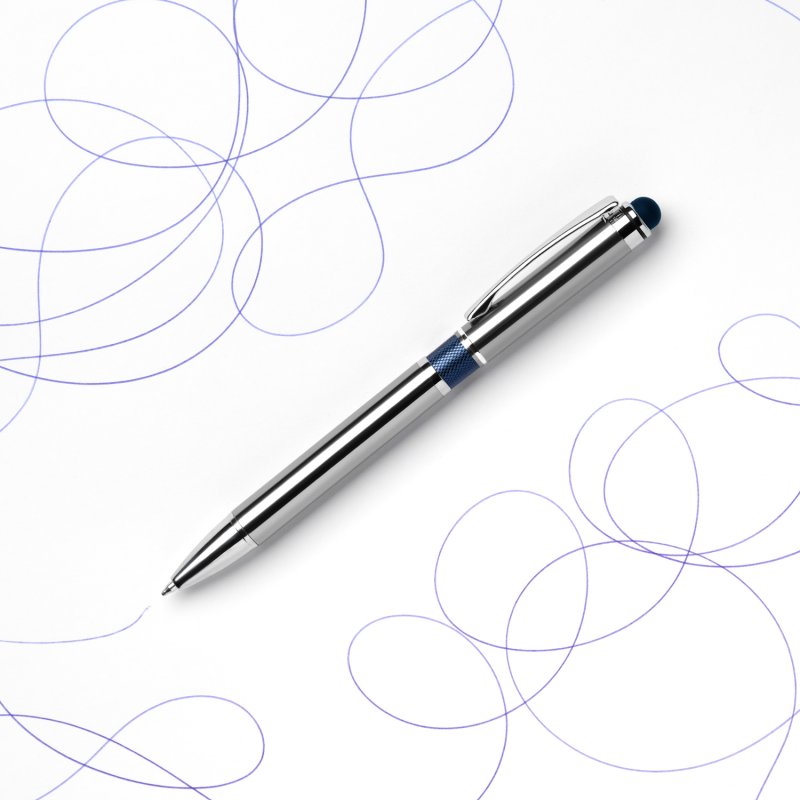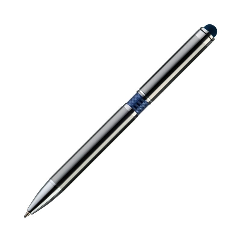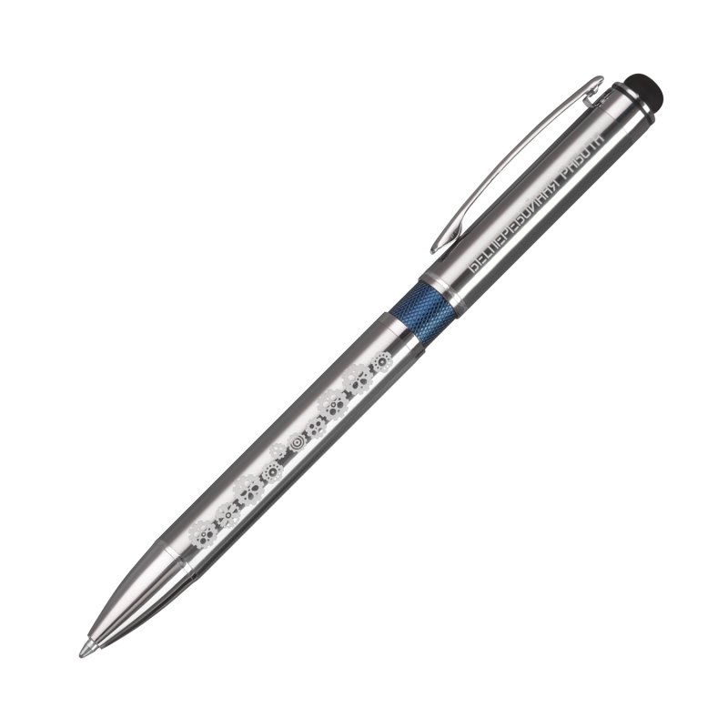 Классическая ручка цвета металлик с цветными деталями. Оснащена стилусом для работы с сенсорными экранами.