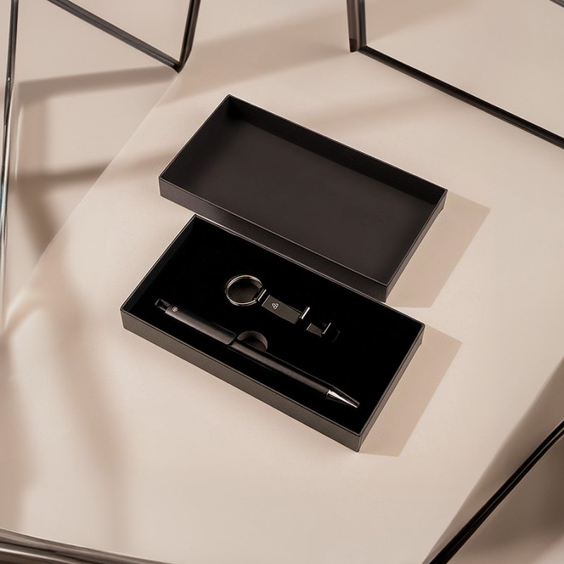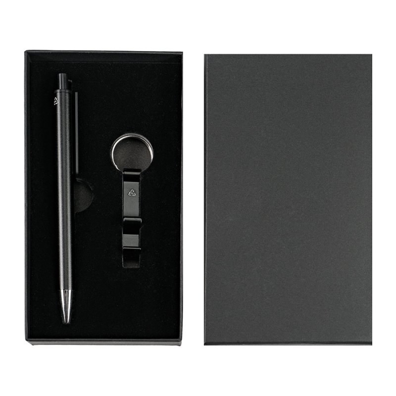 Набор: ручка из переработанного алюминия и брелок-держатель для телефона с функцией открывашки. Упаковка коробка из дизайнерского картона.