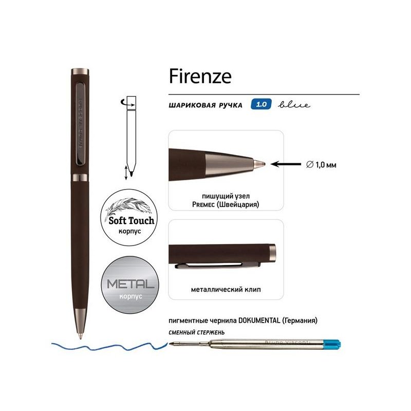 Ручка автоматическая, с легким поворотным механизмом подачи стержня. Надежный пишущий узел d 1,0 мм (от швейцарского производителя Premec) гарантирует высокое качество также, как и пигментные чернила Dokumental (Германия). Благодаря им писать ручкой Firenze одно удовольствие – она мягко скользит по поверхности бумаги, оставляя ровную, четкую линию.