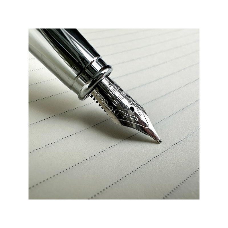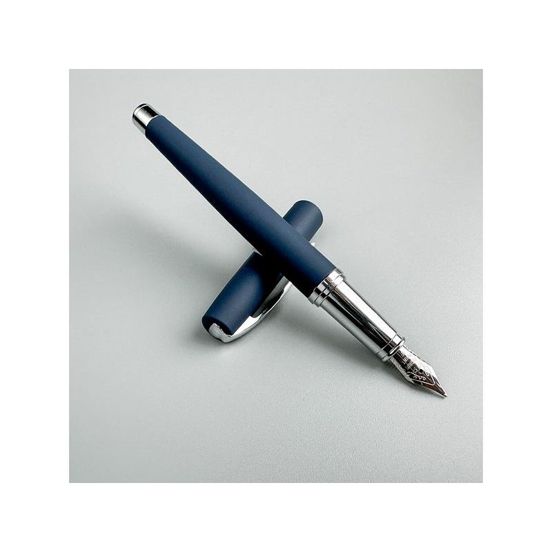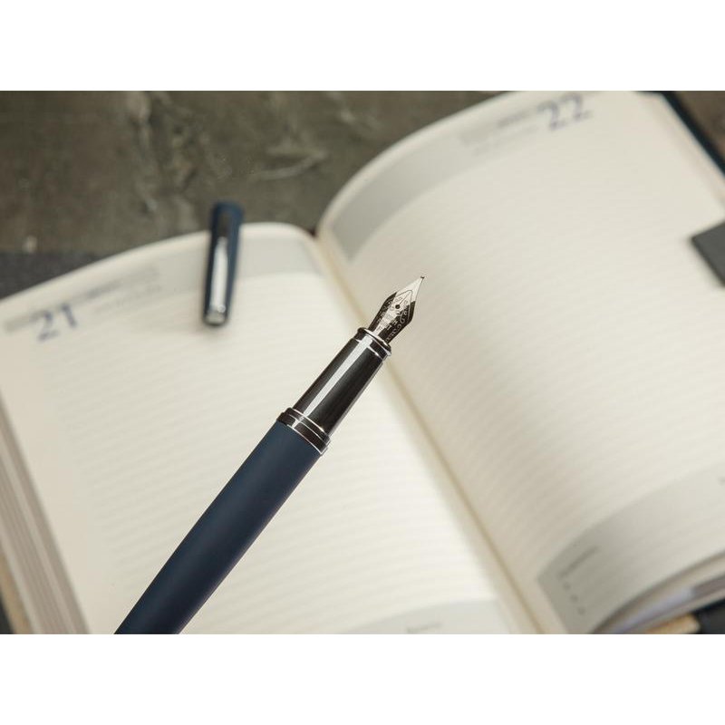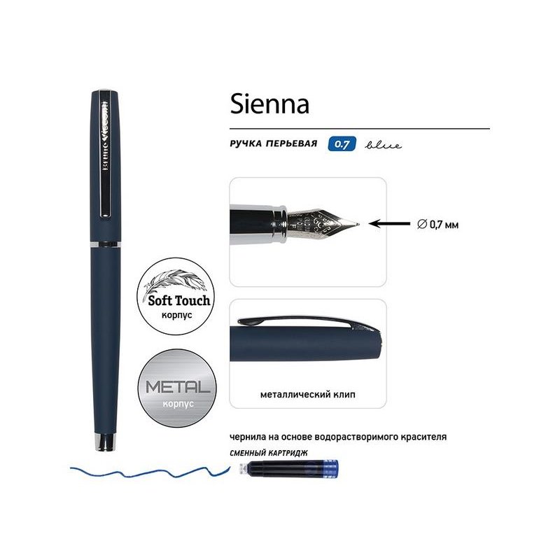 Cтильная перьевая ручка Sienna от Bruno Visconti синего цвета с контрастирующими элементами в цвет серебра.Благодаря покрытию Soft Touch пальцы не скользят по корпусу ручки, письмо комфортное и легкое. Ручка оснащена высококачественным механизмом подачи чернил, благодаря которому линия остается однородной и аккуратной. Чернила не токсичны, на основе водорастворимого красителя, не забивают фидер. Перьевой наконечник выполнен из иридиума и дополнен орнаментом.