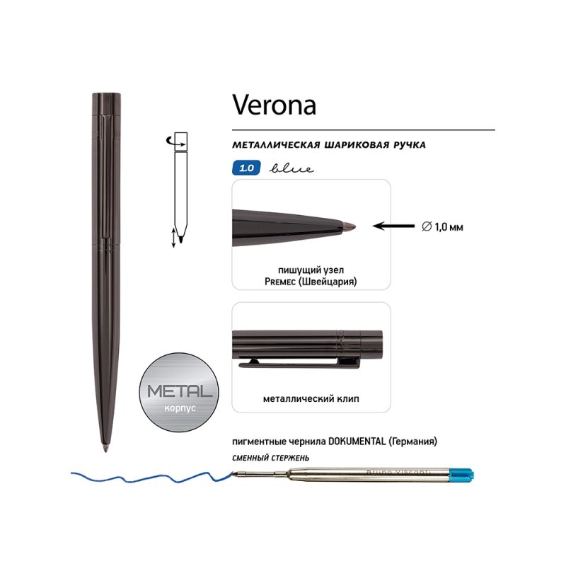 Металлическая шариковая ручка Verona - аксессуар, призванный стать настоящим элементом стиля, подчеркнуть индивидуальность его владельца.