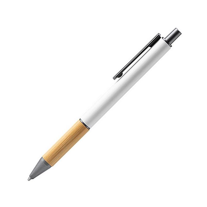 Металлическая шариковая ручка с матовым покрытием, бамбуковой вставкой и деталями темного цвета.
