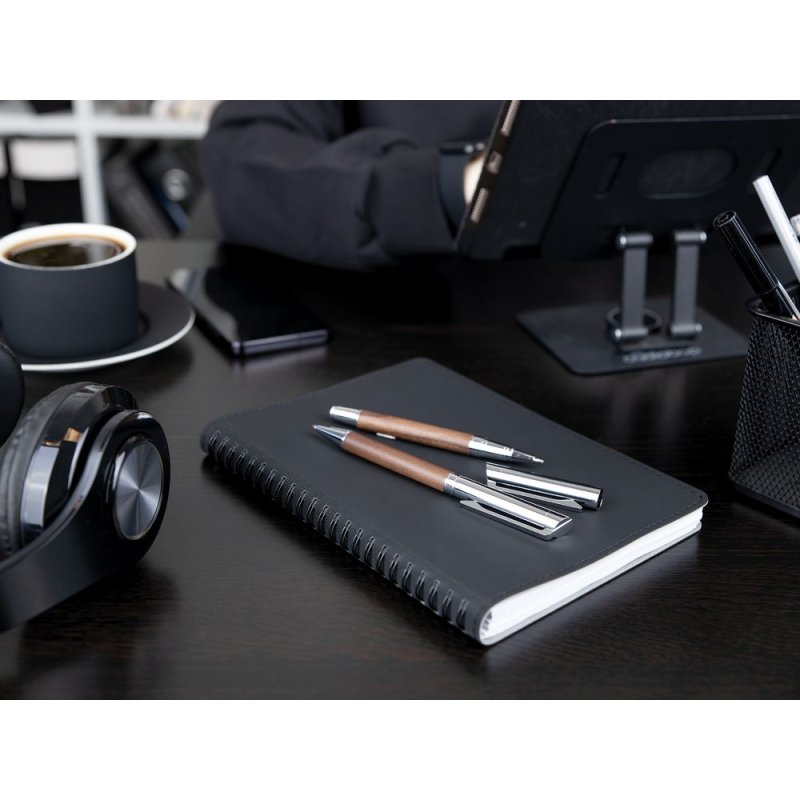 Шариковая ручка в деревянном корпусе с металлическими деталями.