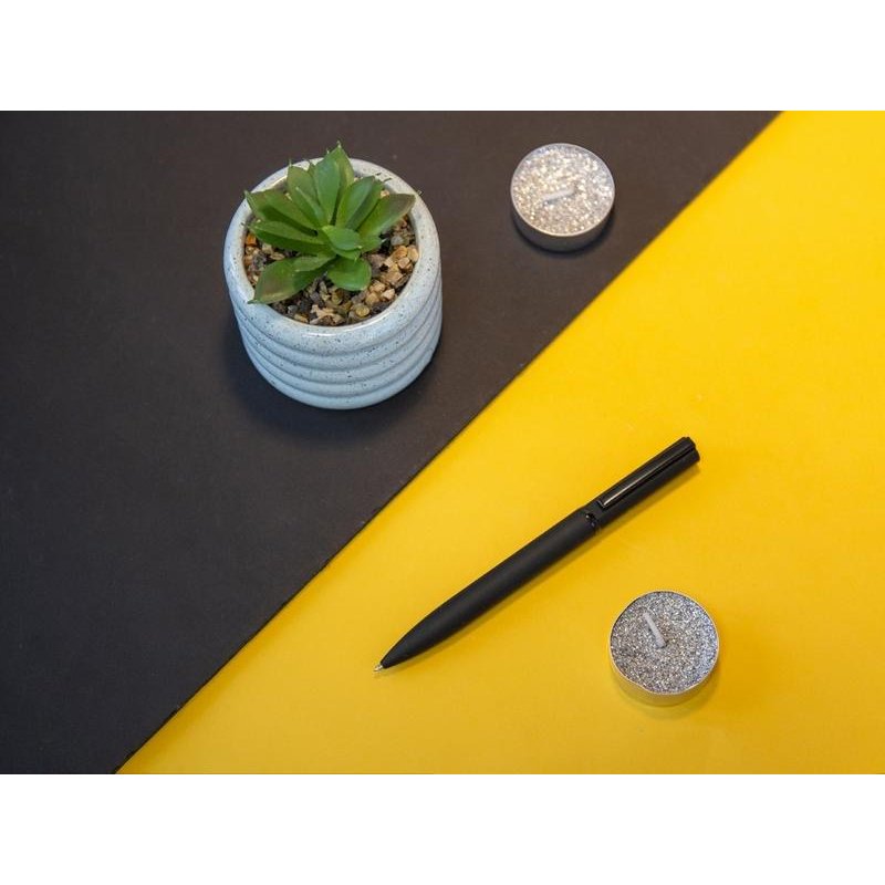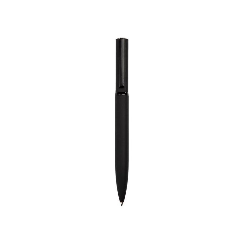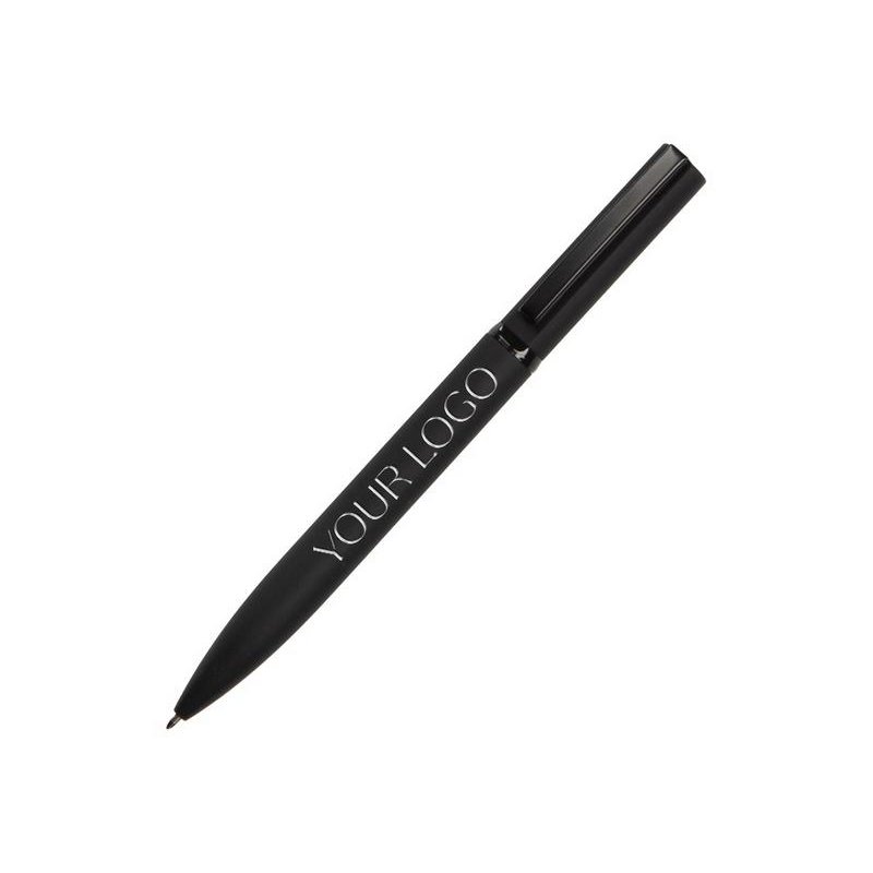 Эта металлическая ручка имеет очень необычную интересную форму — верхняя часть (до поворотного механизма) уже, чем нижняя. За счёт покрытия софт-тач ручка очень приятна на ощупь. При гравировке вскрывается серебристый слой.