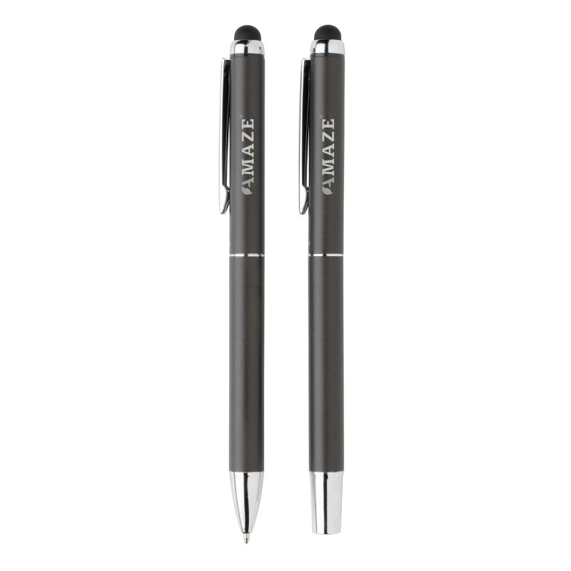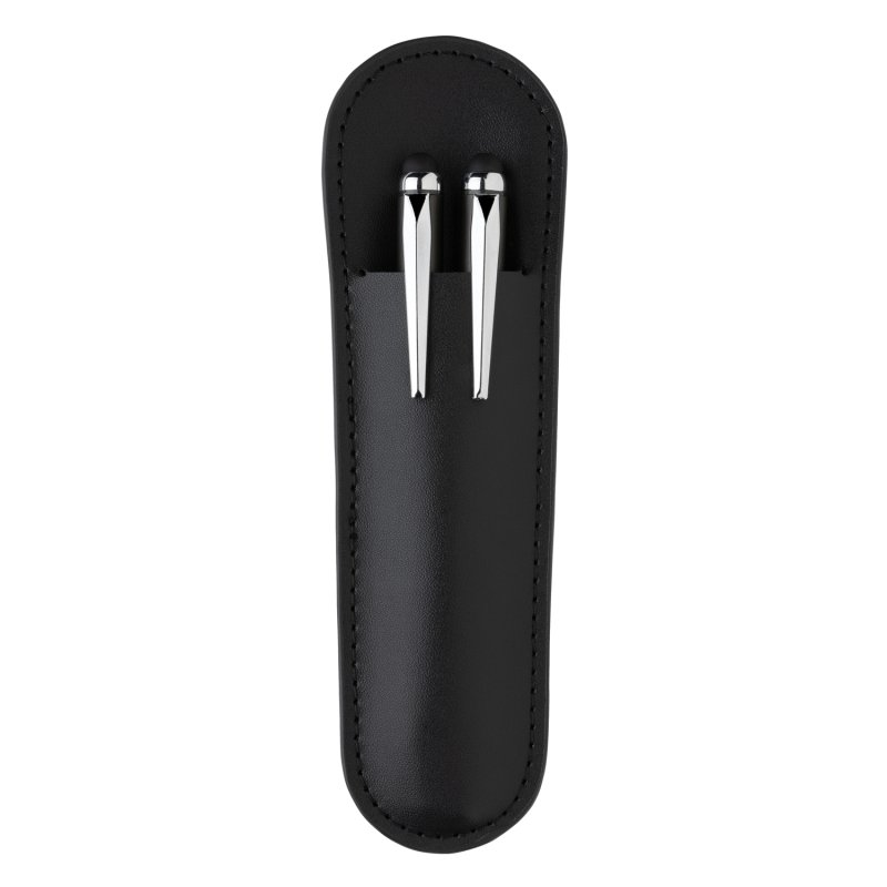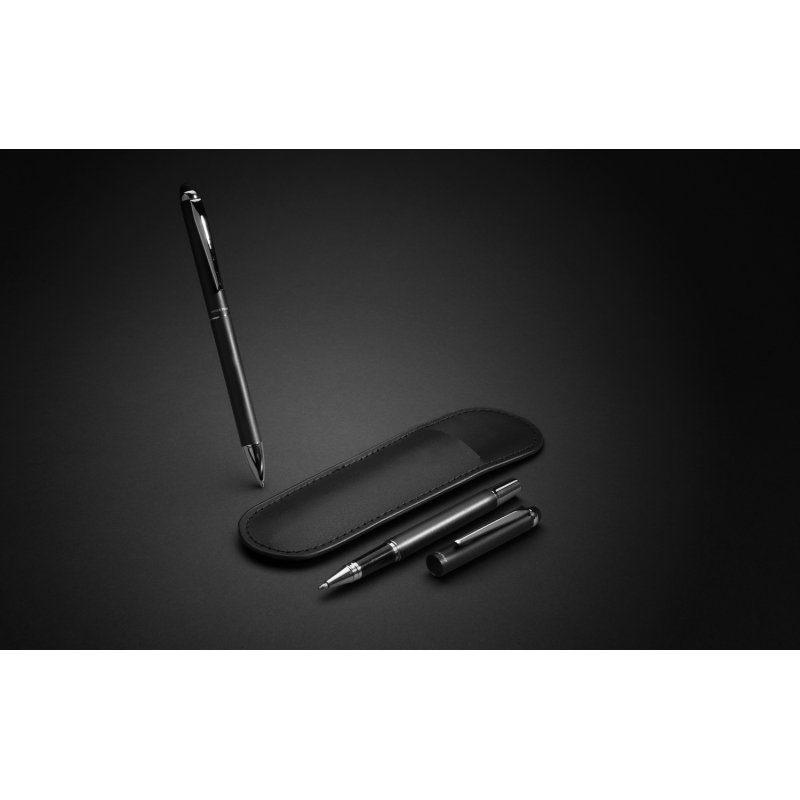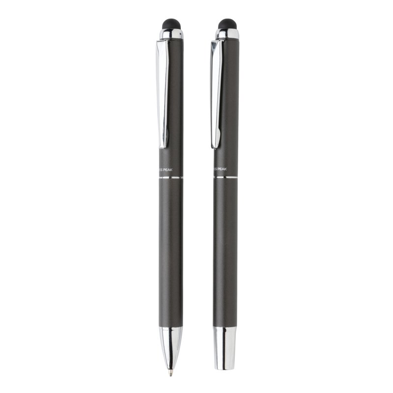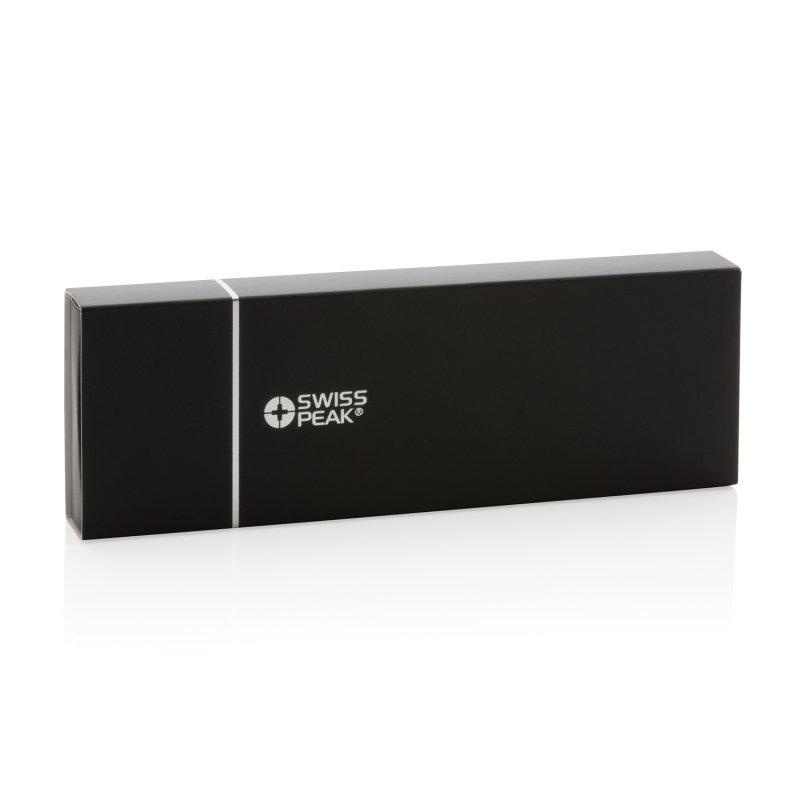 Роскошный набор от Swiss Peak включает в себя шариковую ручку и ручку-роллер. Матовый алюминиевый корпус с серебристым глянцевым клипом. Обе ручки заправлены немецкими чернилами Dokumental синего цвета. Длина письма для шариковой ручки — 1200 м, для ручки-роллера — 400 м. Набор поставляется с чехлом из полиуретана и фирменной черной коробкой.