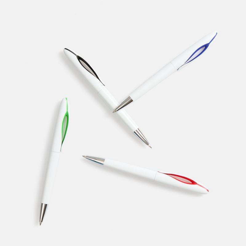 Шариковая ручка приятных округлых форм с белым глянцевым корпусом и цветовым акцентом.