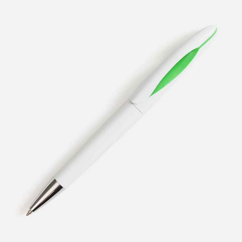 Шариковая ручка приятных округлых форм с белым глянцевым корпусом и цветовым акцентом.