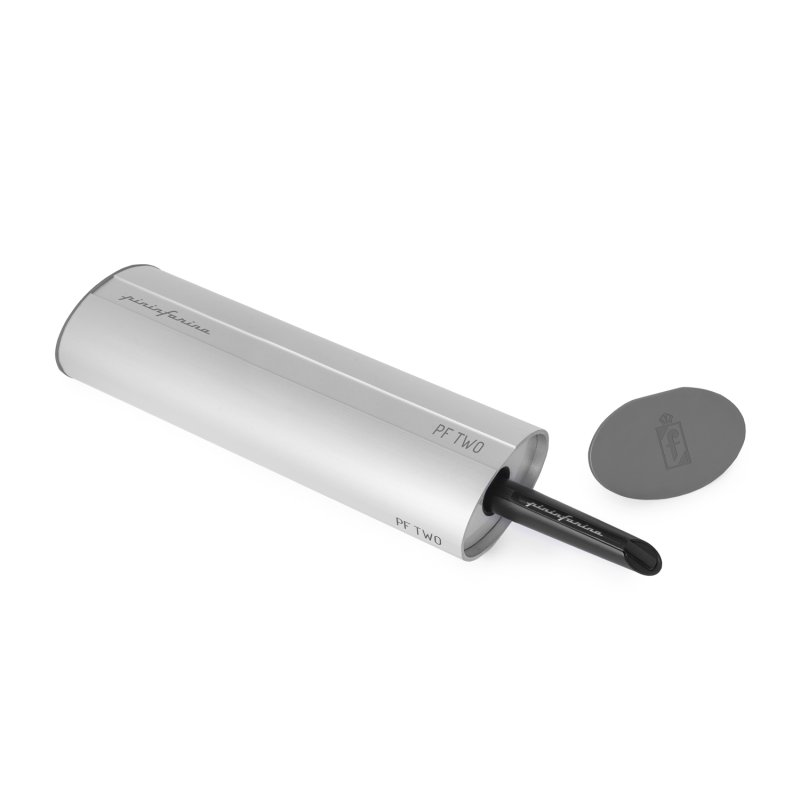 Перьевая ручка PF Two от дизайнеров Pininfarina, обладатель премии Red Dot Design Award 2021. Точные геометрические формы и уникальное техническое исполнение ручки превращают ее из пишущего инструмента в совершенный аксессуар. Скошенные линии колпачка. Элегантное сочетание черного матового корпуса и глянцевого клипа на колпачке ручки. Фидер (устройство подачи чернил) ручки выполнен с помощью микромеханической техники, специально откалиброван, обеспечивает длительный срок службы чернил и защищает при перепадах атмосферного давления и температуры. Поршневой поворотный конвертер возможно заменить на картридж. Перо стальное, тонкое F. Длина ручки 15 см, вес 45 гр. Упакована в серебристую округлую подарочную коробку.