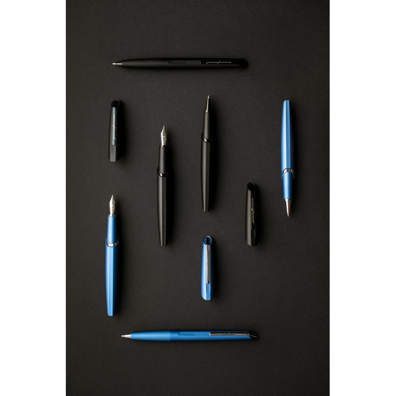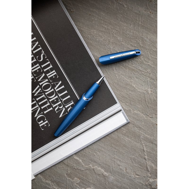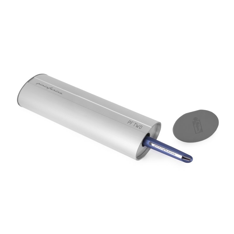 Роллер из коллекции 2021 года PF Two от дизайнеров Pininfarina. Точные геометрические формы и уникальное техническое исполнение ручки превращают ее из пишущего инструмента в совершенный аксессуар. Скошенные линии колпачка. Элегантное сочетание синего матового корпуса и серебристого полированного клипа на колпачке ручки. Корпус ручки выполнен из алюминия, ее длина 15 см, вес 40 гр. Упакована в серебристую округлую подарочную коробку. В ручке используется чернильный стержень Schmidt SRC 5888 с синей пастой.