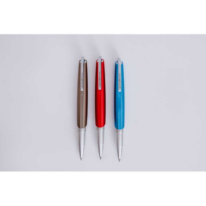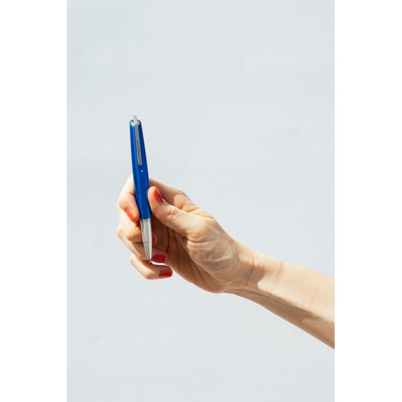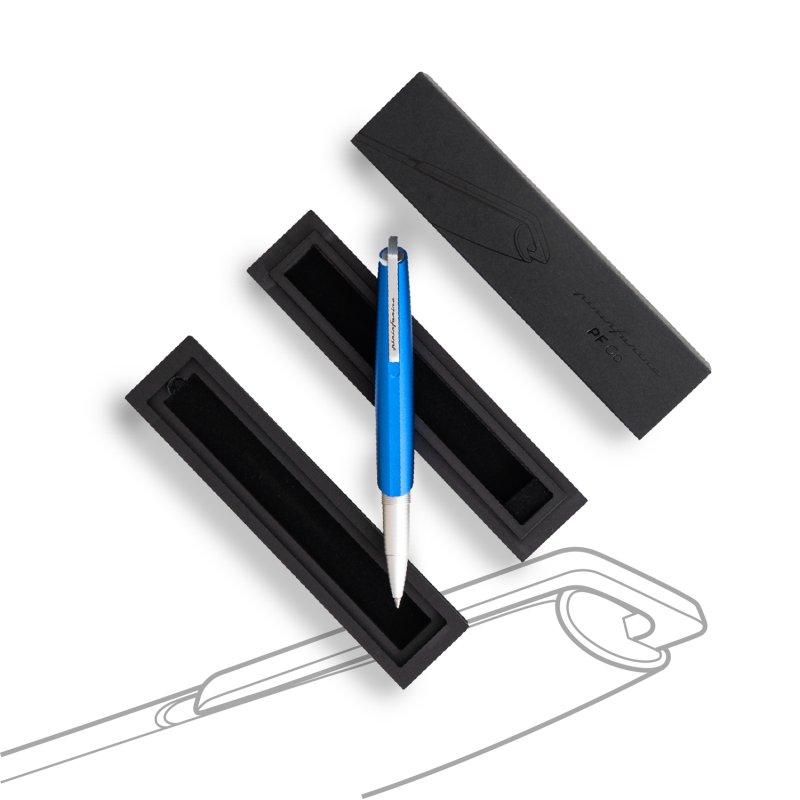 Роллер из коллекции 2023 года PF Go от дизайнеров Pininfarina. Дизайн и простота использования - вот те составляющие, которые вдохновили Pininfarina на создание коллекции GO. Сочетание ярко-синего завинчивающегося колпачка и корпуса серебристого цвета. Корпус ручки выполнен из алюминия, ее длина 12 см, диаметр 1 см, вес 29 гр. Оригинальный дизайн клипа. Упакована в черную коробку из дизайнерского многослойного картона 15х3,5х2 см. В ручке используется чернильный стержень Schmidt P8127 с синей пастой. Сделана в Италии.