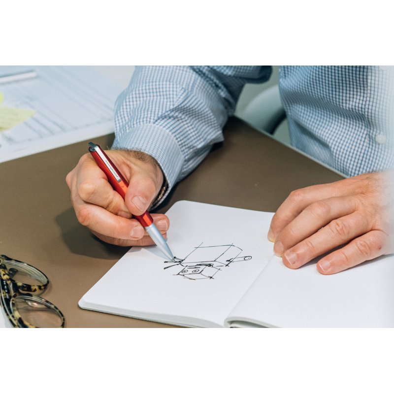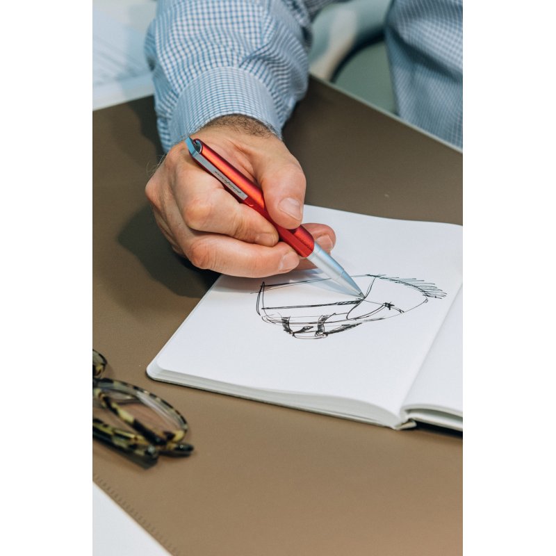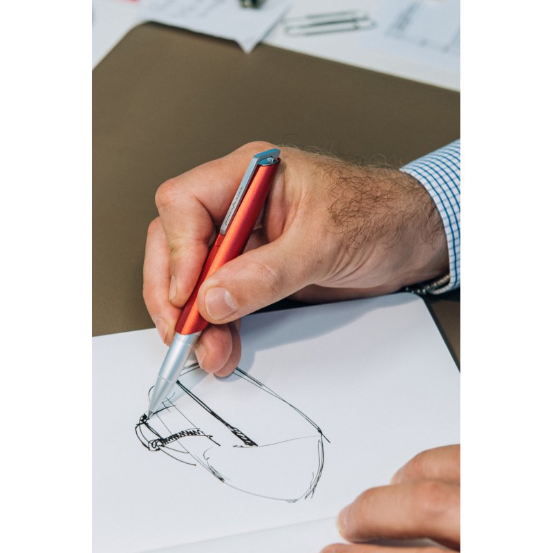 Роллер из коллекции 2023 года PF Go от дизайнеров Pininfarina. Дизайн и простота использования - вот те составляющие, которые вдохновили Pininfarina на создание коллекции GO. Сочетание ярко-красного завинчивающегося колпачка и корпуса серебристого цвета. Корпус ручки выполнен из алюминия, ее длина 12 см, диаметр 1 см, вес 29 гр. Оригинальный дизайн клипа. Упакована в черную коробку из дизайнерского многослойного картона 15х3,5х2 см. В ручке используется чернильный стержень Schmidt P8127 с синей пастой. Сделана в Италии.