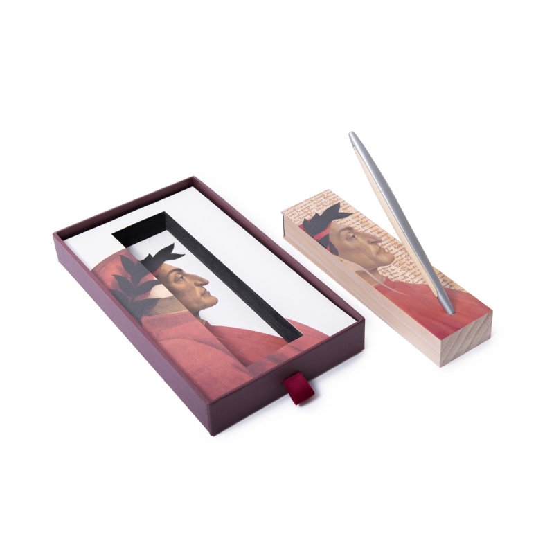 Лимитированная коллекция бренда Pininfarina CAMBIANO BOX EXCLUSIVE DANTE 700TH ANNIVERSARY в память о Данте Алигьере, приуроченная к 700-летию его смерти. На коробке из массива кедра, которая является одновременно настольной подставкой для шариковой ручки Cambiano, изображен культовый портрет великого итальянского поэта, написанный мастером эпохи Возрождения Сандро Боттичелли между 1480 и 1485 годами. Именно этот портрет сделал профиль Данте узнаваемым во всем мире. Корпус ручки выполнен из алюминия с вставками из кедрового дерева. Вес ручки 39 гр, длина 16 см. В ручке используется шариковый стержень CROSS® 8513 с синей пастой. Набор упакован в подарочную коробку.
