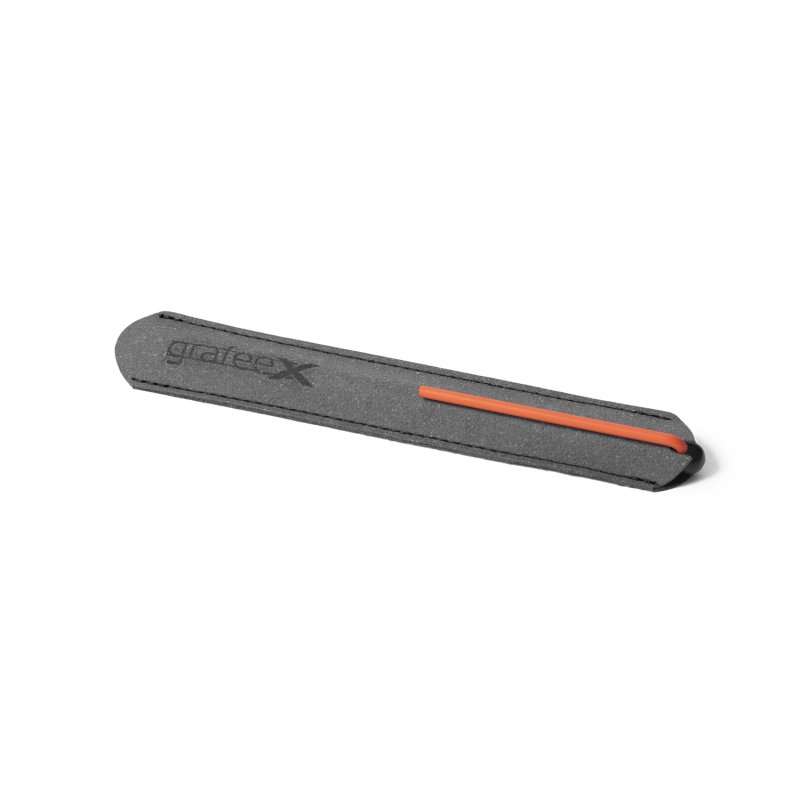 Шариковая ручка с цельным алюминиевым матовым корпусом черного цвета и ярко-оранжевым клипом. Дизайн ручки такой же, как и у инновационного карандаша GrafeeX. В ручке используется шариковый стержень CROSS® 8513 с синей пастой, который выдвигается с помощью поворотного механизма Ручка вкладывается в элегантный темно-серый чехол с серой прострочкой, сшитый вручную из рециклированной кожи.