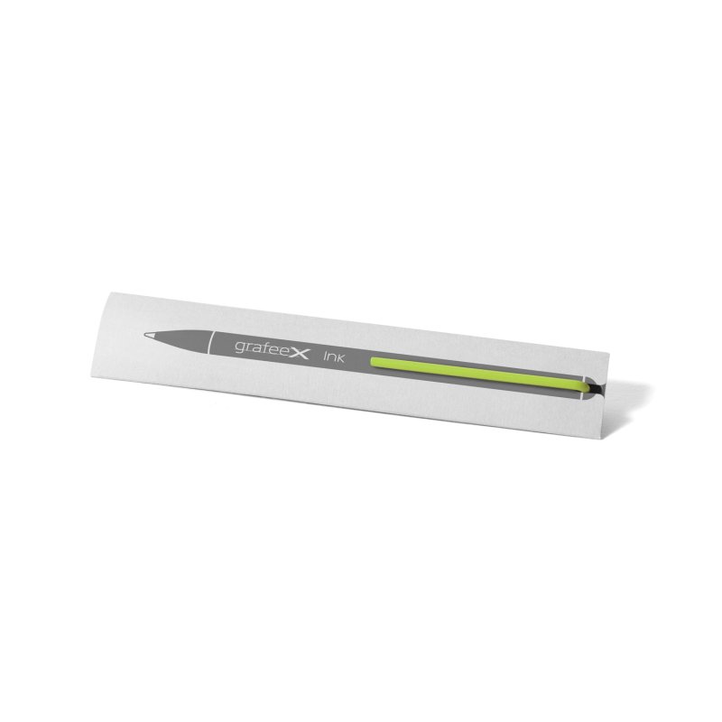 Шариковая ручка с цельным алюминиевым матовым корпусом черного цвета и ярко-зеленым клипом. Дизайн ручки такой же, как и у инновационного карандаша GrafeeX.В ручке используется шариковый стержень CROSS® 8513, который выдвигается с помощью поворотного механизма. Ручка вкладывается в элегантный темно-серый чехол с серой прострочкой, сшитый вручную из рециклированной кожи.