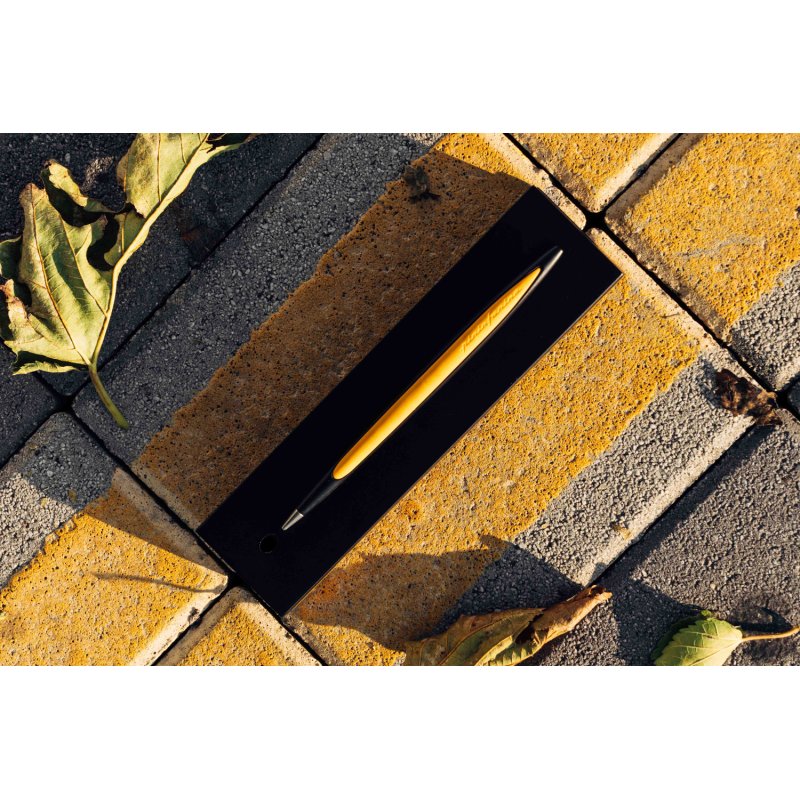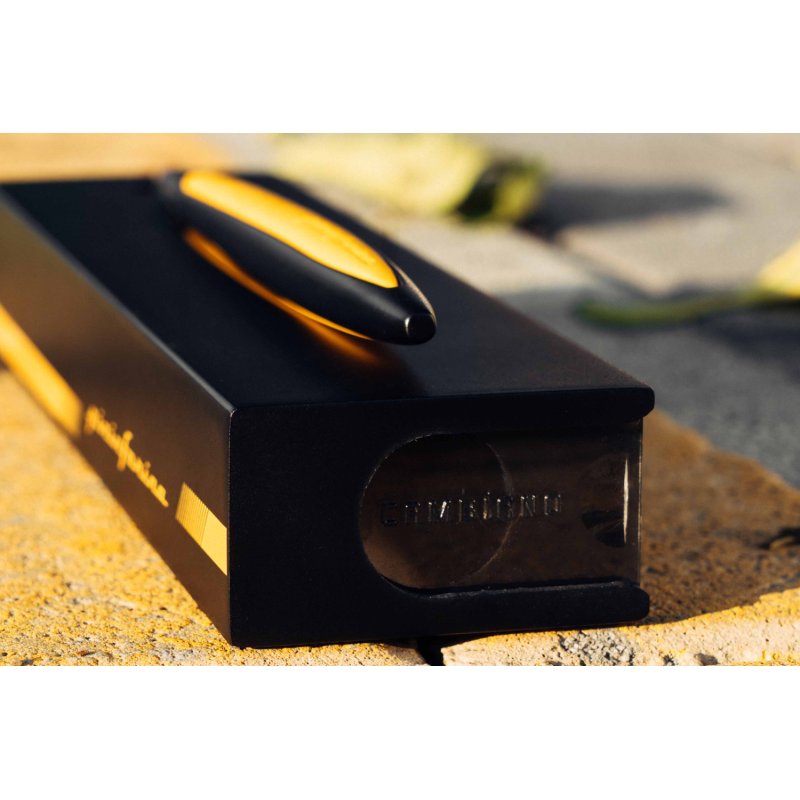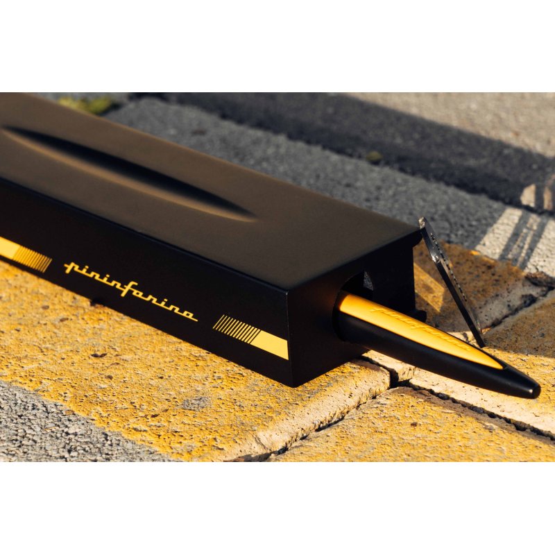 Флагманская ручка модели Cambiano Race Yellow дизайнерского дома Pininfarina сочетает в себе различные материалы, технологичность, элегантные линии и смелые дизайнерские решения. Она предназначена для тех, кто любит спортивный дизайн и стремится к уникальному опыту письма. Алюминиевый корпус ручки окрашен в черный цвет, а желтые эргономичные резиновые вставки мгновенно вызывают ассоциации с миром автоспорта и служат для оптимального захвата. Изысканная подставка из черного дерева, служащая одновременно коробкой для ручки, вручную покрыта черным лаком и позволяет превратить этот набор в уникальный арт-объект на вашем столе. Этот набор полностью изготовлен вручную, идеально воплощает итальянское мастерство, дух гонок и является символом высшего качества и эксклюзивности. Вечная ручка имеет необычный пишущий узел в виде наконечника Ethergraf, который изготовлен из сплава металлов по запатентованной технологии. Он не содержит свинец и алюминий, производится вручную итальянскими мастерами и практически не расходуется за десятилетия использования. При соприкосновении с поверхностью бумаги, происходит химическая реакция и наконечник оставляет серебристый след, который напоминает цвет графитового карандаша, но обладает большей стойкостью. Вес ручки 39 гр, длина 16 см.