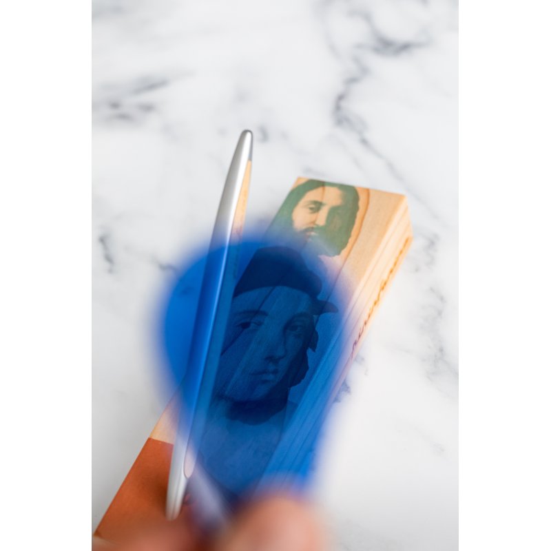 Лимитированная коллекция бренда Pininfarina в память о Рафаэле, одном из трех титанов эпохи Возрождения, приуроченная к 500-летию его смерти. Отличительной особенностью творчества Рафаэля является умение работать с цветом, поэтому дизайнеры бренда Pininfarina создали уникальный дизайн настольной подставки для своей флагманской ручки Cambiano с тремя автопортретами Мастера. Две поляризованные линзы - синего и красного цветов - подчеркивают приверженность Рафаэля к техническим деталям и к виртуозному синтезу всех достоинств живописи в одном произведении. Использование одной из линз проявляет одно изображение и убирает второе. В результате вы можете увидеть три различных дизайна одной коробки. Вечная ручка дизайнерского дома Pininfarina сочетает в себе роскошь и смелые дизайнерские решения. Pininfarina Cambiano - это объединение различных материалов, технологичность и элегантные линии. Вечная ручка имеет необычный пишущий узел в виде наконечника Ethergraf, который изготовлен из сплава металлов по запатентованной технологии. Он не содержит свинец и алюминий, производится вручную итальянскими мастерами и практически не расходуется за десятилетия использования. При соприкосновении с поверхностью бумаги, происходит химическая реакция и наконечник оставляет серебристый след, который напоминает цвет графитового карандаша, но обладает большей стойкостью. Идеально пишет на каменной бумаге. Корпус ручки выполнен из алюминия с вставками из кедрового дерева. Вес ручки 39 гр, длина 16 см. Коробка выполнена из дерева кедра и одновременно является настольной подставкой для ручки.