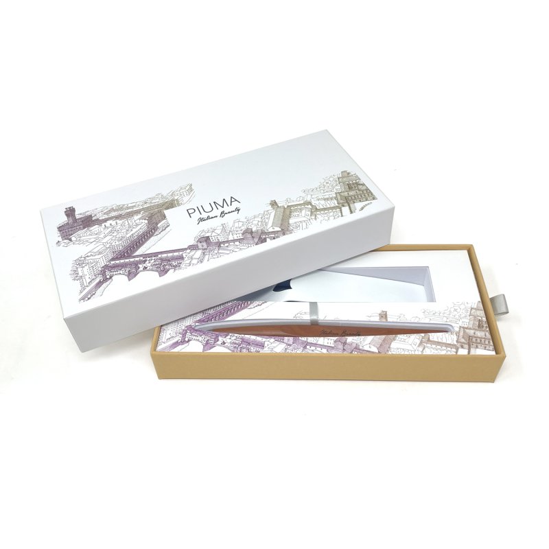 Вечная ручка Pininfarina Piuma Флоренция из лимитированной коллекции дизайнеров Pininfarina в сотрудничестве с Francesco Corni Foundation, посвященной красоте Италии и представленной 8 городами. Франческо Корни - выдающийся дизайнер из Модены, посвятивший свою жизнь популяризации истории и архитектуры. Используя трехмерное перспективное видение, он изучает наиболее значимые здания каждого города, выбирает наилучшую точку обзора, чтобы подчеркнуть их особенности, и прорисовывает детали в древней технике калиграфии. Дополняет видение мастера умелое использование цветов, по одному для каждого города. Для Флоренции дизайнер выбрал центром композиции Corridoio Vasariano, идущий от Palazzo Vecchio до Palazzo Pitti, и фиолетовый цвет, в результате подарочная коробка c ручкой Pininfarina PIUMA становится произведением искусства. PIUMA - ручка динамической формы в виде гусиного пера. Дизайнеры вдохновлялись Кодексом о полете птиц мастера Леонардо да Винчи, целью которого было понять тайну полета и который хранится сейчас в Королевской библиотеке Турина. Piuma находится в постоянном равновесии со своим центром тяжести благодаря белому стальному пьедесталу. Вечная ручка имеет необычный пишущий узел в виде наконечника Ethergraf®, изготовленного из сплава металлов по запатентованной технологии. Он не содержит свинец и алюминий, производится вручную итальянскими мастерами и практически не расходуется за десятилетия использования. При соприкосновении с поверхностью бумаги, происходит химическая реакция и наконечник оставляет серебристый след, который напоминает цвет графитового карандаша, но обладает большей стойкостью. Идеально пишет на каменной бумаге. На ручке стильный логотип Italian Beauty, она полностью сделана из дерева груши. Набор упакован в белую подарочную коробку.