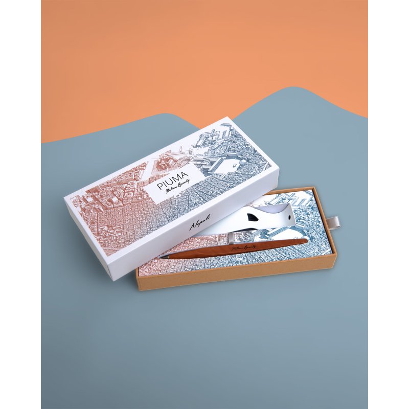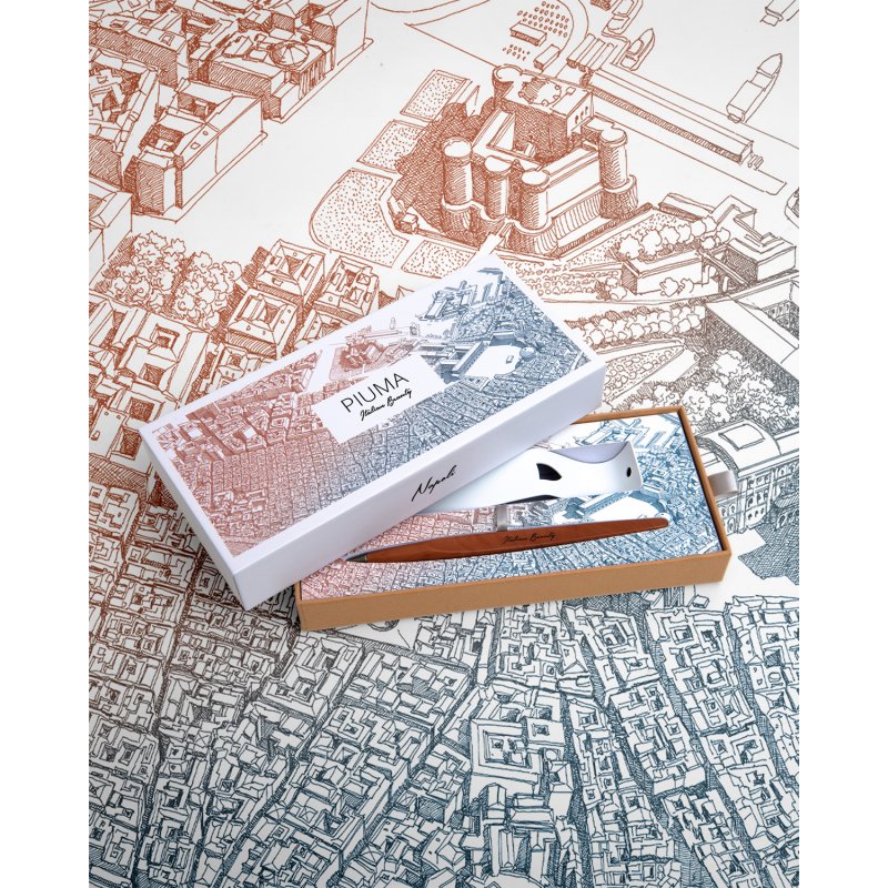 Вечная ручка Pininfarina Piuma Неаполь из лимитированной коллекции дизайнеров Pininfarina в сотрудничестве с Francesco Corni Foundation, посвященной красоте Италии и представленной 8 городами. Франческо Корни - выдающийся дизайнер из Модены, посвятивший свою жизнь популяризации истории и архитектуры. Используя трехмерное перспективное видение, он изучает наиболее значимые здания каждого города, выбирает наилучшую точку обзора, чтобы подчеркнуть их особенности, и прорисовывает детали в древней технике калиграфии. Дополняет видение мастера умелое использование цветов, по одному для каждого города. Для Неаполя дизайнер выбрал центральной точкой площадь Piazza del Plebiscito и светло-синий цвет, в результате подарочная коробка c ручкой Pininfarina PIUMA становится произведением искусства. PIUMA - ручка динамической формы в виде гусиного пера. Дизайнеры вдохновлялись Кодексом о полете птиц мастера Леонардо да Винчи, целью которого было понять тайну полета и который хранится сейчас в Королевской библиотеке Турина. Piuma находится в постоянном равновесии со своим центром тяжести благодаря белому стальному пьедесталу. Вечная ручка имеет необычный пишущий узел в виде наконечника Ethergraf®, изготовленного из сплава металлов по запатентованной технологии. Он не содержит свинец и алюминий, производится вручную итальянскими мастерами и практически не расходуется за десятилетия использования. При соприкосновении с поверхностью бумаги, происходит химическая реакция и наконечник оставляет серебристый след, который напоминает цвет графитового карандаша, но обладает большей стойкостью. Идеально пишет на каменной бумаге. На ручке стильный логотип Italian Beauty, она полностью сделана из дерева груши. Набор упакован в белую подарочную коробку.
