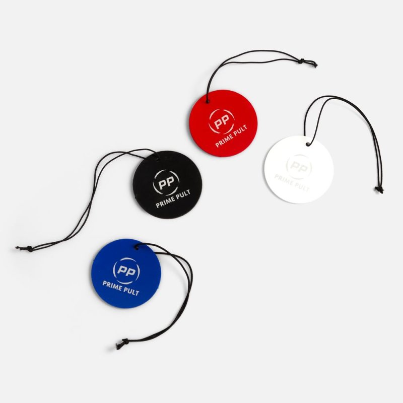 Круглая пластинка из ароматизированного пластика на подвесе-резинке.
