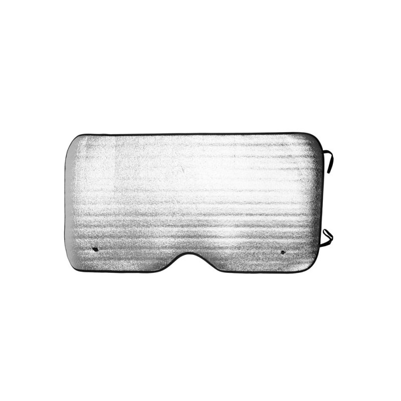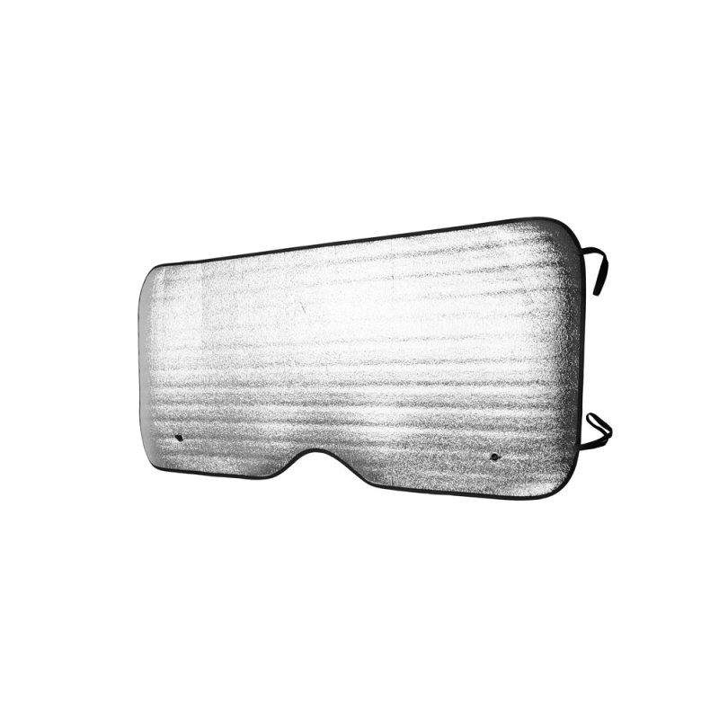 Прямоугольный автомобильный солнцезащитный козырек с алюминиевой передней частью и белой пенопластовой задней частью. Два металлических люверса в обоих верхних углах для присосок. Черная окантовка и эластичные лямки для складывания.