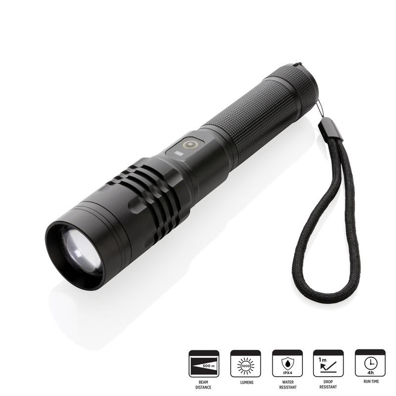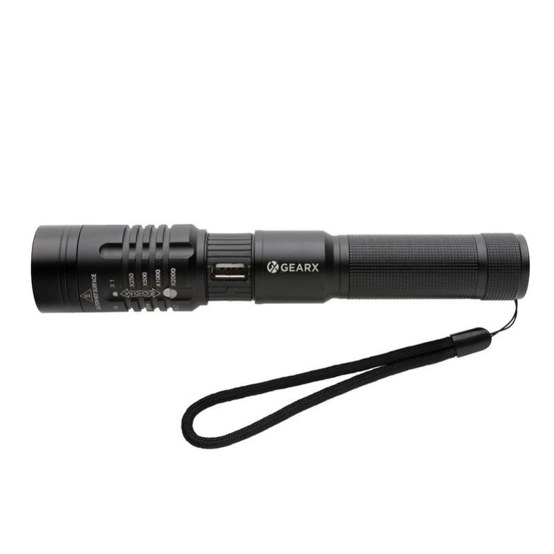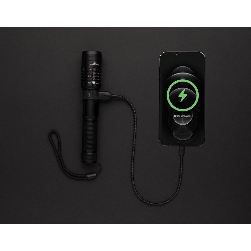 Функциональность, производительность и дизайн сочетаются в этом фонаре Gear X с аккумулятором, который можно заряжать снова и снова. Корпус из высококачественного алюминиевого сплава комфортно ложится в руку. Благодаря классу защиты IP4 подходит для использования на улице даже в ненастную погоду. Мощная лампа обеспечит вам яркость до 1000 люмен и длину луча до 500 метров. Фонарь оснащен аккумулятором, который легко подзарядить при помощи USB-кабеля. 5 режимов освещения, включая сигнал SOS. Аккумулятора емкостью 2000 мАч достаточно, чтобы использовать фонарь до 4 часов без подзарядки.