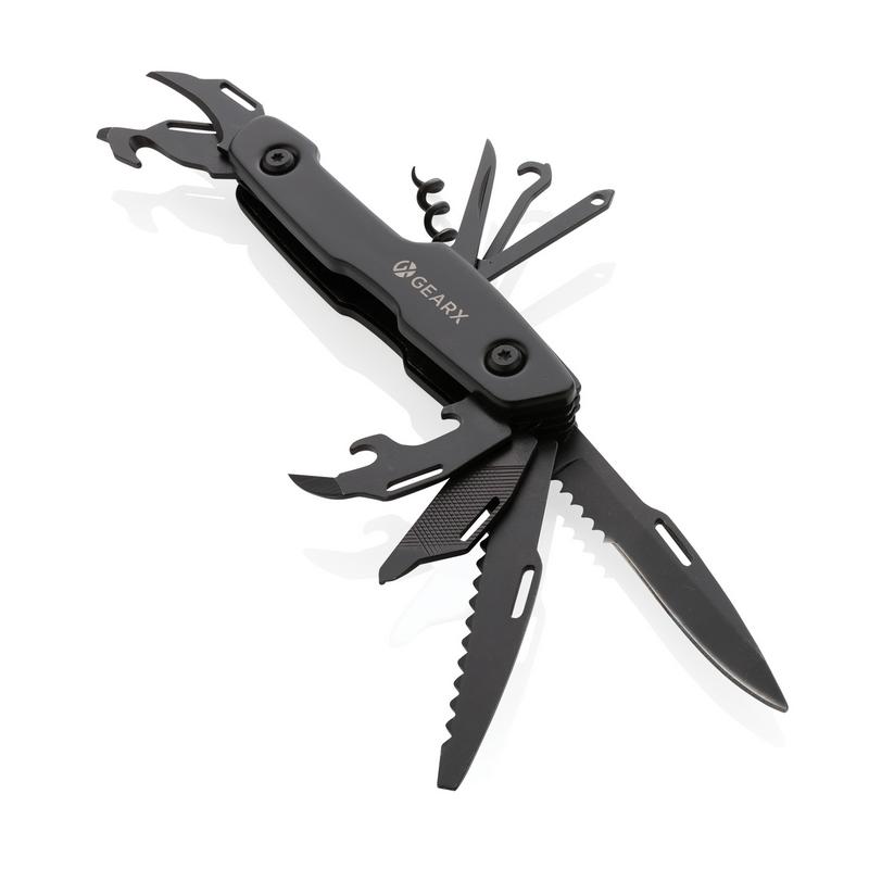 Компактный многофункциональный нож Gear X объединяет в себе самые необходимое инструменты. Черный алюминиевый корпус прекрасно сочетается с инструментами из нержавеющей стали премиум-класса 420. Включает в себя 13 функций: нож, пилу, шлицевую отвертку, консервный нож, напильник, маленькую отвертку Philips, отвертку Philips, штопор, нитенаправитель, дырокол, нож для коробок, открывалку для бутылок и маленькое лезвие. Карманный нож Gear X будет всегда под рукой и в любой момент готов к использованию. Поставляется в стильной подарочной коробке.