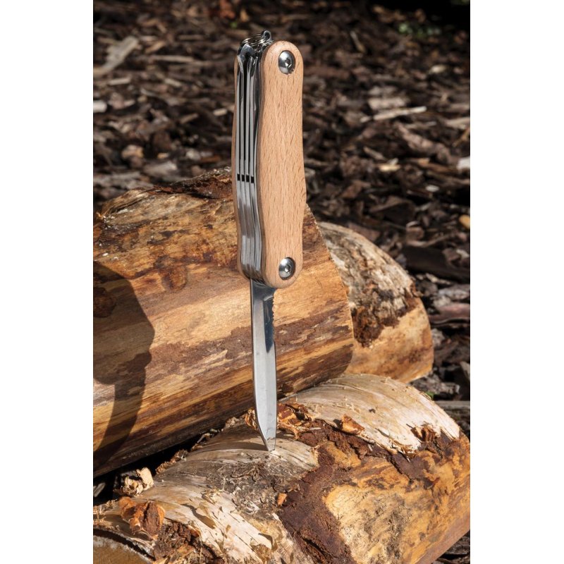 Компактный и прочный нож с 11 функциями, корпус которого выполнен из бука, а инструменты – из нержавеющей стали. В ноже предусмотрены: нож, зубатый нож, ножницы, напильник, пилка, инструмент для шитья, экстрактор для извлечения рыболовного крючка, крестообразная отвертка, плоская отвертка. Поставляется в подарочной упаковке.
