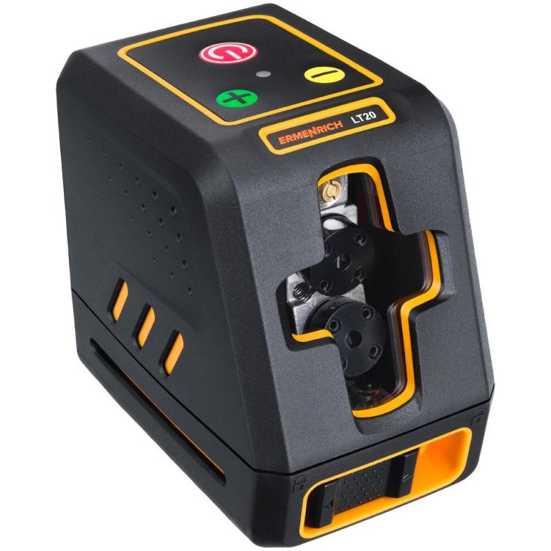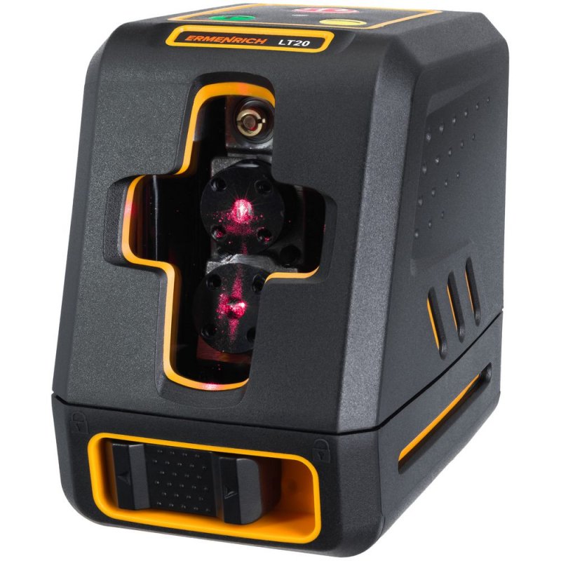 Корпус уровня Ermenrich LT20 снабжен креплением для установки на штатив стандартного диаметра. При выборе штатива с наклонной платформой можно расширить диапазон работы лазера, отклоняя источник света на нужный угол и получая новую конфигурацию линий. Прибор защищен от пыли и распыления воды, что позволяет не бояться сложных условий ремонта. Питается уровень от обычных батареек, яркость можно регулировать. Даже при выборе максимальной интенсивности лазера срок работы на одной паре батареек достигает 40 часов.