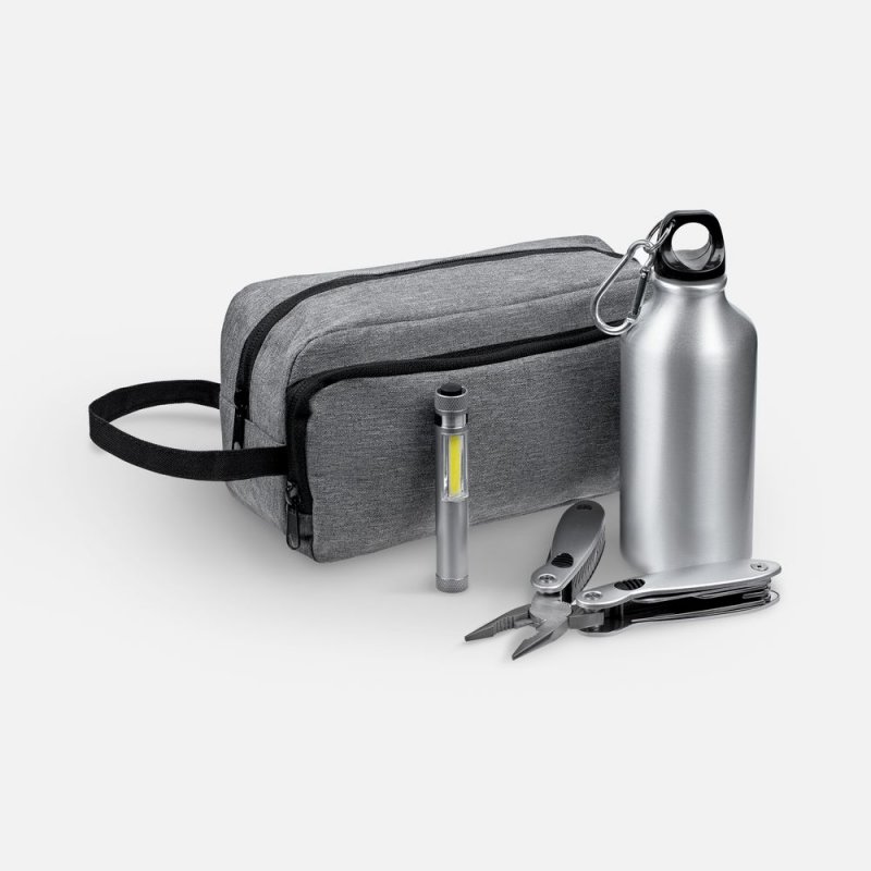 - Материал:мультитул, фонарик, бутылка - алюминий; несессер - полиэстер