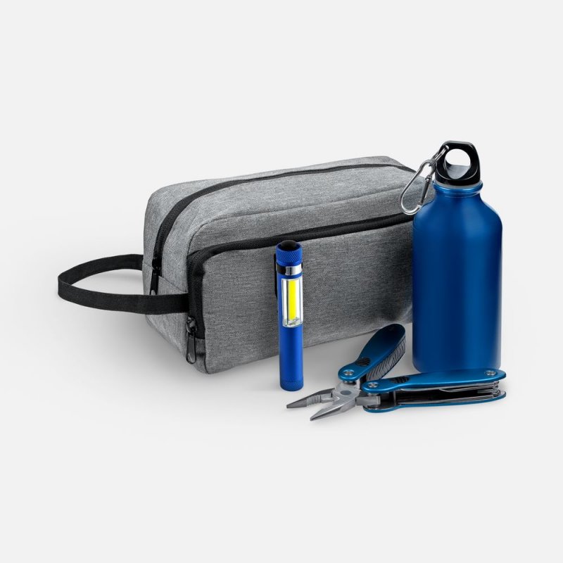 - Материал:мультитул, фонарик, бутылка - алюминий; несессер - полиэстер