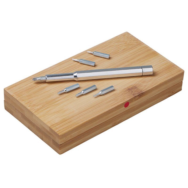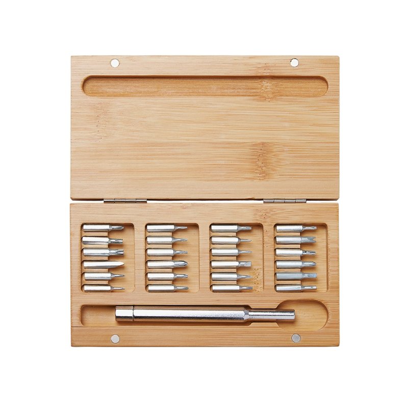 Стильный и практичный набор отверток в элегантном корпусе из натурального бамбука. Компактный кейс закрывается на магниты, а верхняя крышка отмечена круглым красным стикером для удобной идентификации. Внутри — отвертка и 24 наиболее востребованные биты: крестовые, плоские и звездочки, которые подойдут для решения большинства бытовых и профессиональных задач. Набор выполнен из экологичных материалов — прочной стали и натурального бамбука. Классическая прямоугольная форма без выступающих деталей делает его особенно удобным для персонализации и нанесения логотипа.
