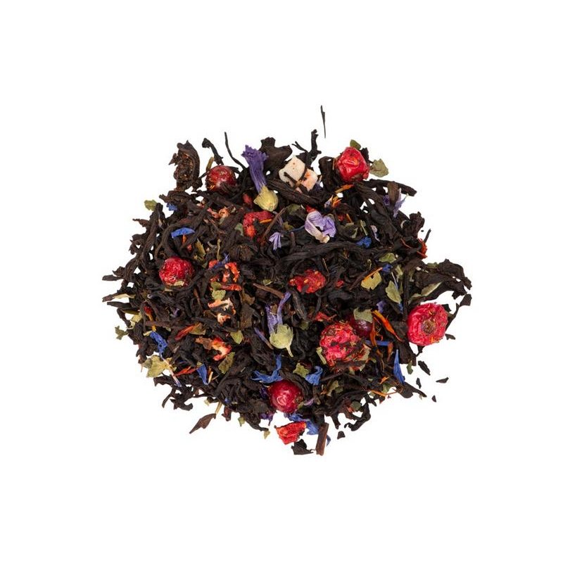 Чёрный индийский чай с лепестками василька и сафлора и ягодами красной смородины, - прекрасный спутник душевного общения. Граф Орлов подарит не только яркое ягодное послевкусие, но и тепло летних дней.