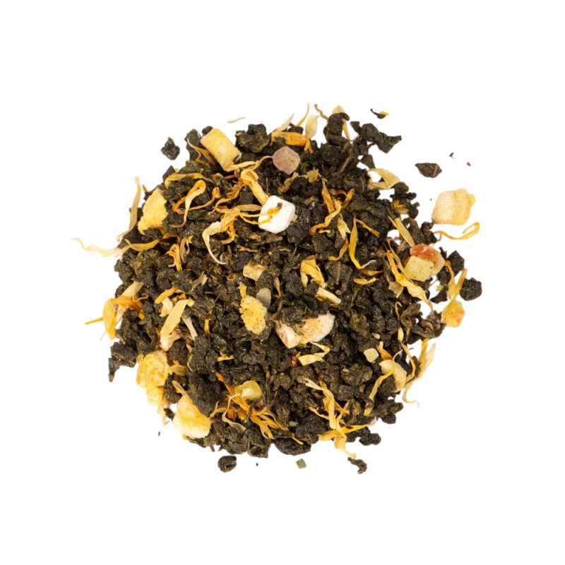 - состав: китайский чай улун Тегуаньинь, кусочки манго сублимированные, кусочки папайи, лепестки календулы, натуральный ароматизатор.;